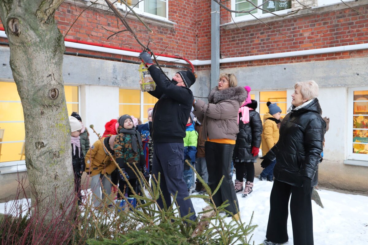 1b klasės mokiniai per gamtos mokslų pamoką kalbėjo apie žvėrelių ir paukštelių gyvenimą. Išgirdę, kaip jiems sunku susirasti maisto žiemą, mielai pritarė, kad jiems reikia padėti. Todėl visa klasės bendruomenė: vaikai, tėveliai, mokytoja Dalia, mokinio padėjėja Stanislava ir socialinė pedagogė Rasa suorganizavo ilgalaikę akciją „Baltasis badas“. Vaikai su tėveliais gamina paukšteliams lesyklėles, renka maistą gyvūnams. Smagu, kai klasėje tarp tėvelių turime miškininkų šeimą Vitkauskus, kurie pažadėjo surinktą maistą nuvežti į mišką. Pradėdami akciją- vieną lesyklėlę pasikabinome mokyklos kieme, kad galėtume stebėti, kokie paukšteliai atskrenda palesti. Akciją tęsime iki vasario mėnesio pabaigos.