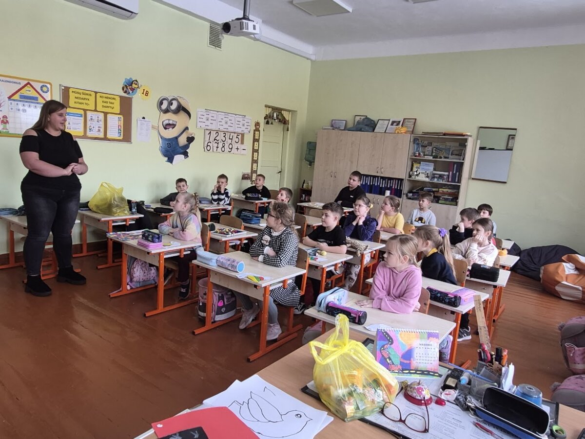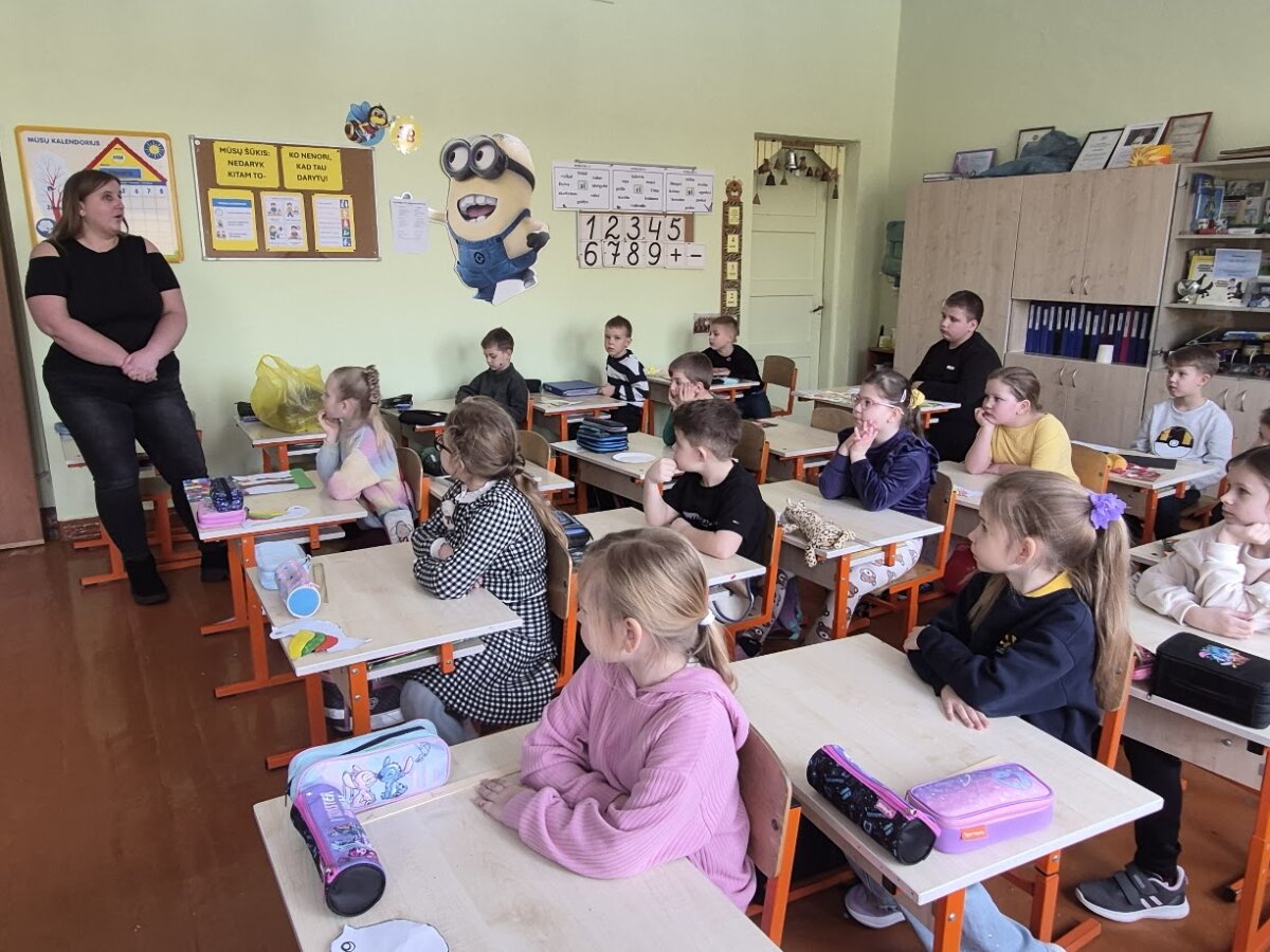 Vykdant akcijos „Baltasis badas“ veiklas, 1B klasės mokiniams klasės valandėlę vedė Vyčio ir Tauro mama Greta Vitkauskienė, medžiotojų ir žvejų draugijos administratorė. Mama labai įdomiai papasakojo vaikams apie Lietuvos miškuose žiemojančius žvėrelius ir paukštelius.