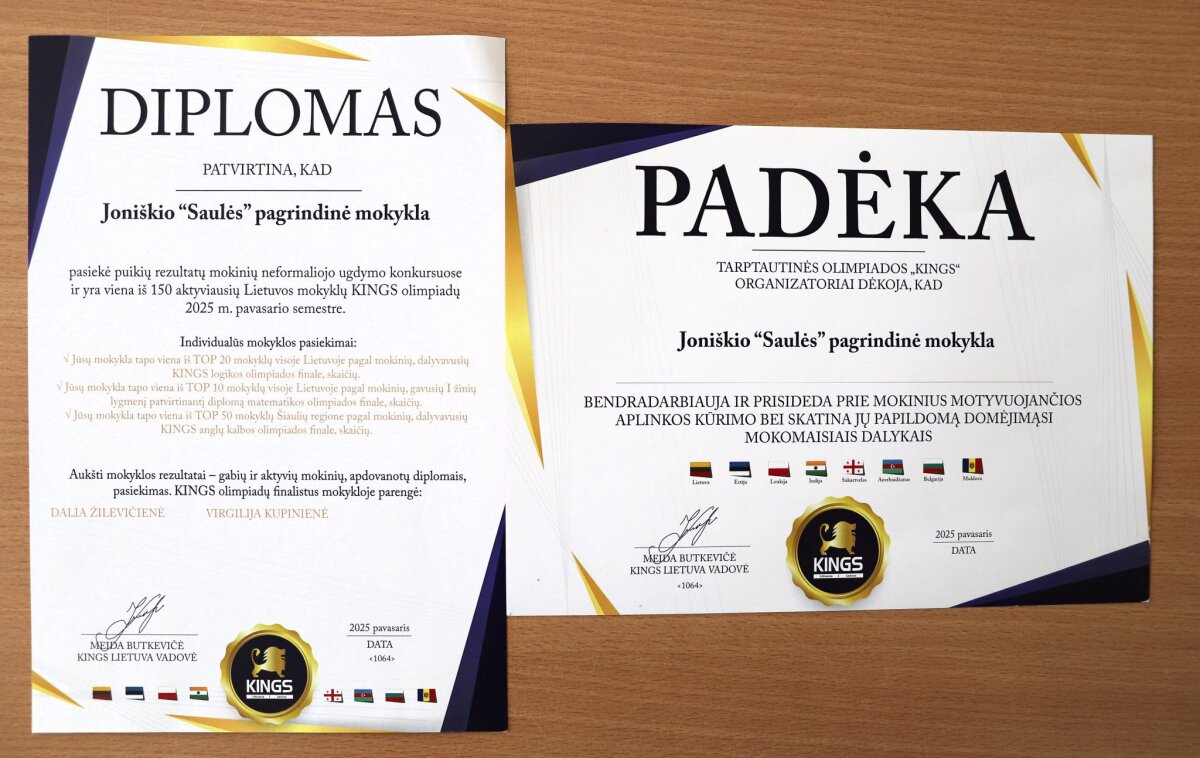 KINGS finalo olimpiados I ir II lygmens diplomais apdovanoti 5B klasės mokiniai Liepa Skirvainytė Benas Budrys, Melita Didžklapytė, Dželena Gofmanaitė, 2B klasės mokiniai Rojus Stonys, Gabija Liepinytė, Gabrielius Čepas, Adamas Ukrinas, Auksė Martinaitytė, Kristupas Vaineikis, 2A – Benas Kapočius (mokytoja V. Manikienė), 6B – Ugnius Skirvainis.