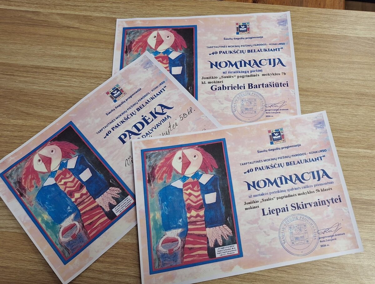 2026 m. kovo mėn. Šiaulių Gegužių progimnazijoje buvo organizuota virtuali tarptautinė 5-8 klasių mokinių kūrybinių darbų paroda-konkursas „40 paukščių belaukiant“. Nuoširdžiai dėkojame mokiniams, kurie puikiai atskleidė paukščių linksmybes, bei improvizavo pagal konkurso temą . Liepai Skirvainytei 5B kl. nominacija „Už nuotaikos perteikimą spalvinės raiškos priemonėmis“, Gabrielei Bertašiūtei nominacija „Už išraiškingą piešinį“, padėka Viltei Šiuipytei 5B kl. mokinei, mokytoja Jūratė Mažunavičienė.