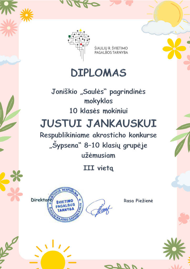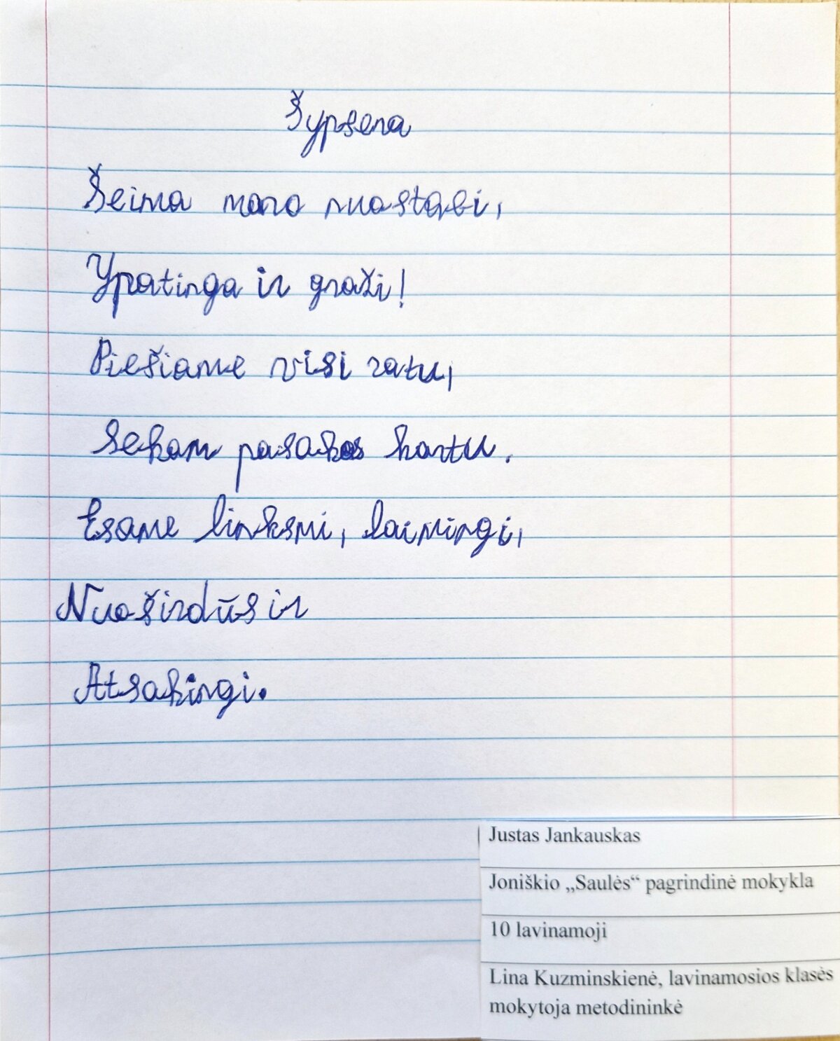 10 lavinamosios klasės mokinys Justas Jankauskas dalyvavo Kuršėnų Pavenčių mokyklos-daugiafunkcio centro surengtame respublikiniame akrosticho konkurse „Šypsena“. Visi konkurso dalyviai buvo suskirstyti į keturias grupes: 1–4, 5–7, 8–10 ir soc. įgūdžių ugdymo klasių. Jaunuolis savo grupėje užėmė III-čią vietą. Sveikiname Justą ir jo mokytoją L. Kuzminskienę!