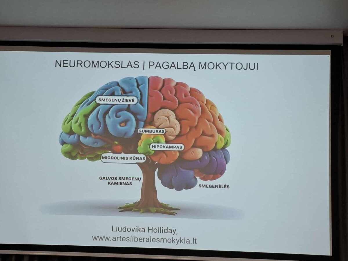 Pranešėja Liudovika Holliday, viena iš Artes Liberales mokyklos įkūrėjų, pristatė pranešimą „Neuromokslas į pagalbą mokytojui”, o Evaldas Melceris, Lietuvos įtraukties švietime centro ergoterapeutas, pasidalino įžvalgomis apie sensoriškai draugiškos aplinkos kūrimą švietimo įstaigose.