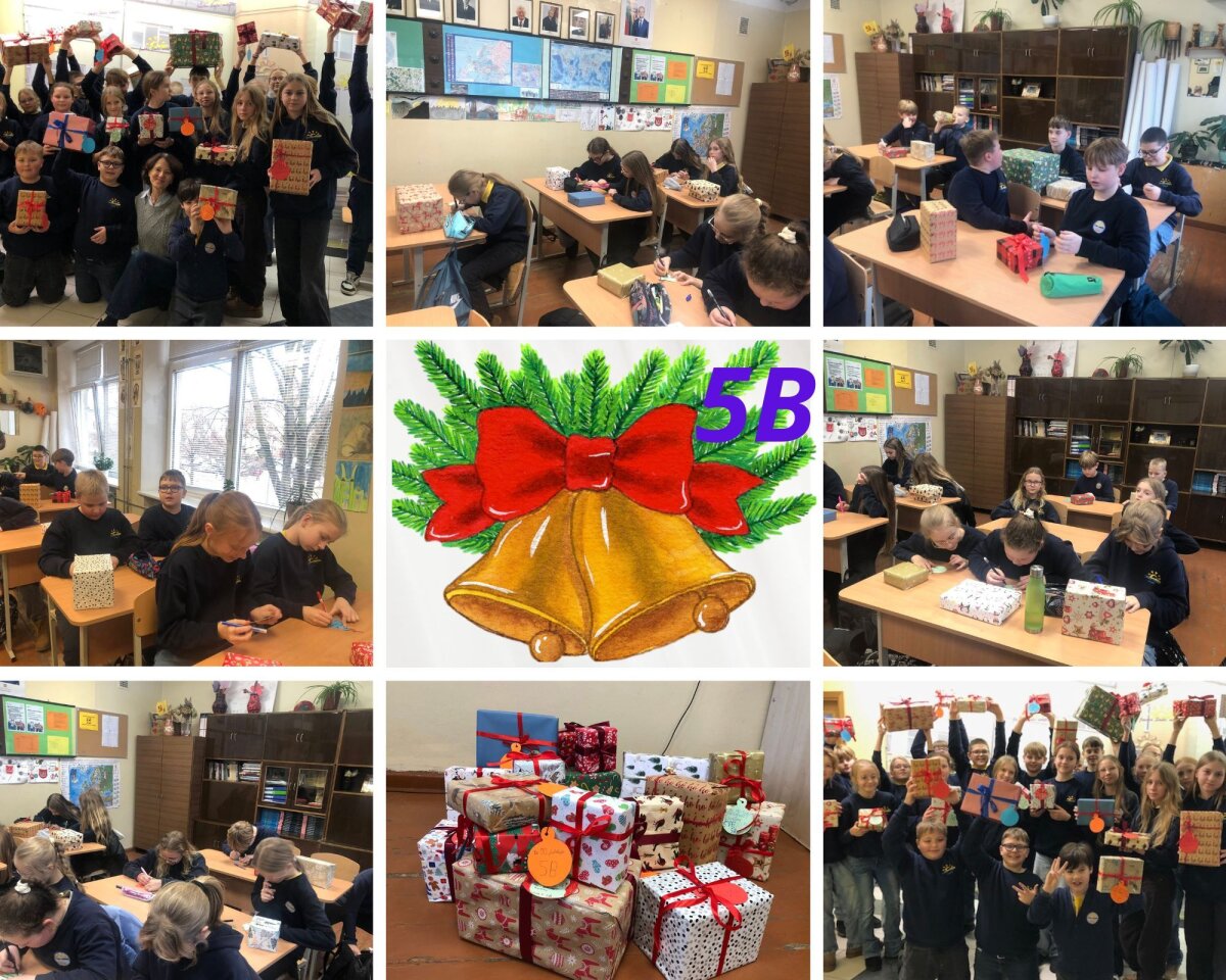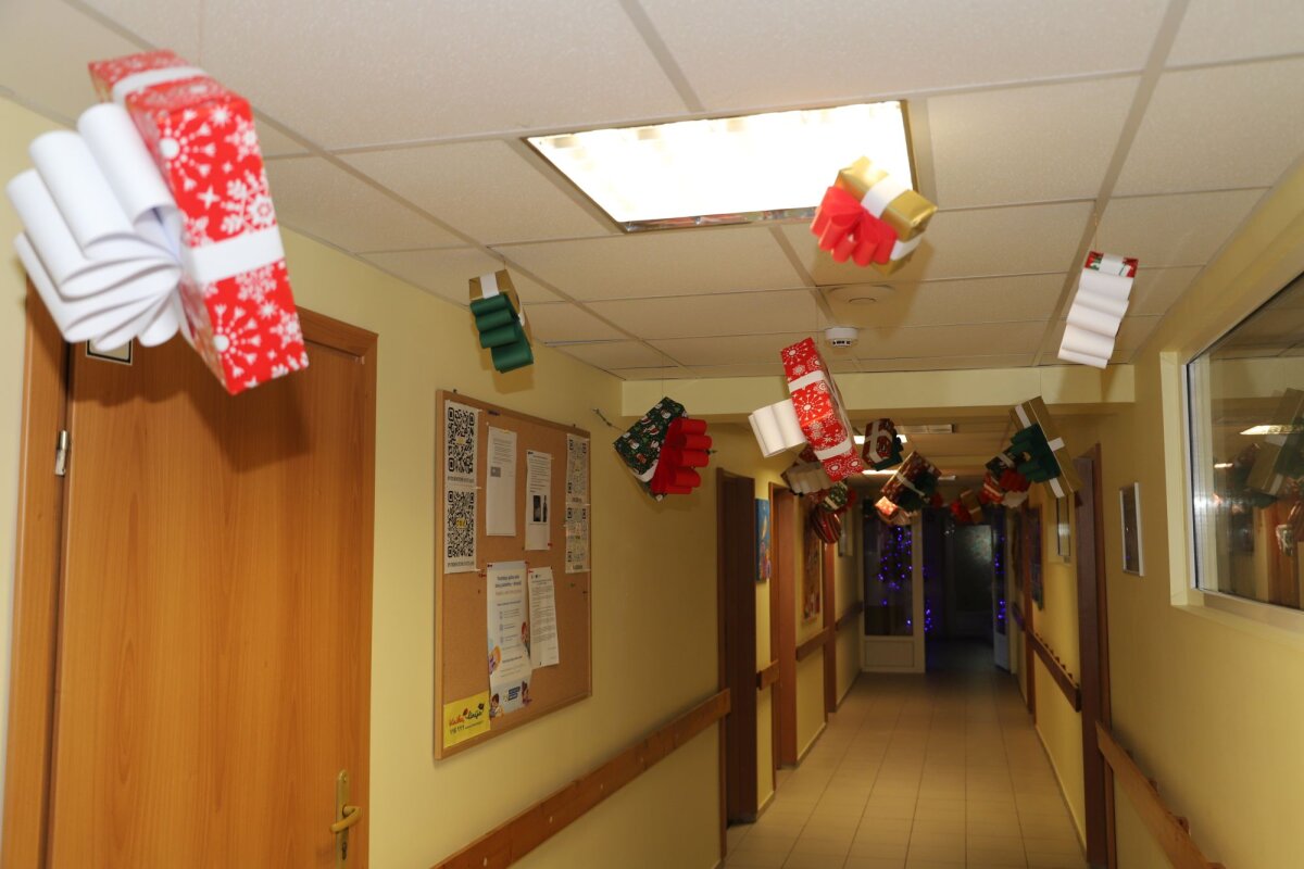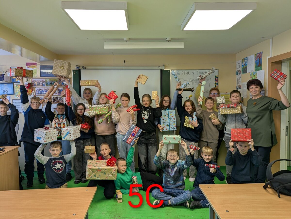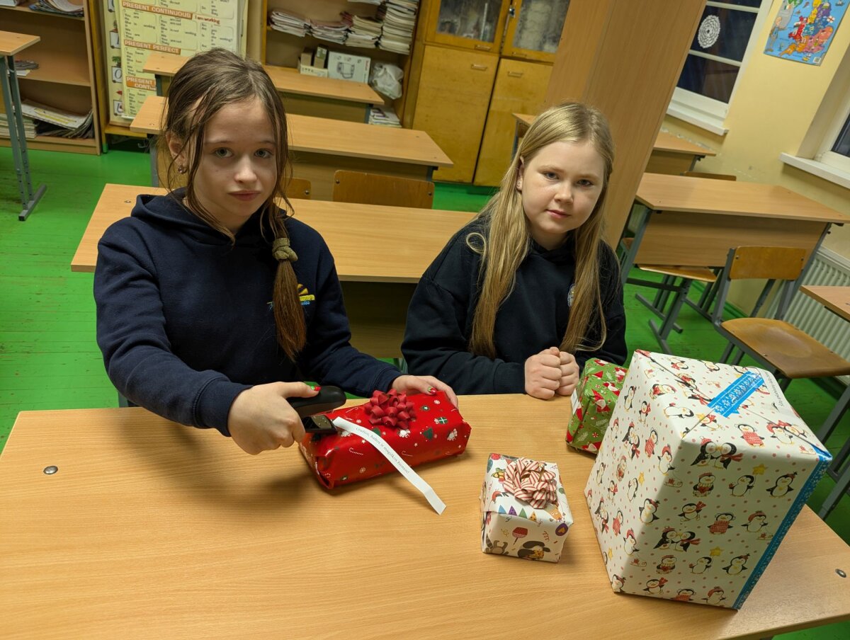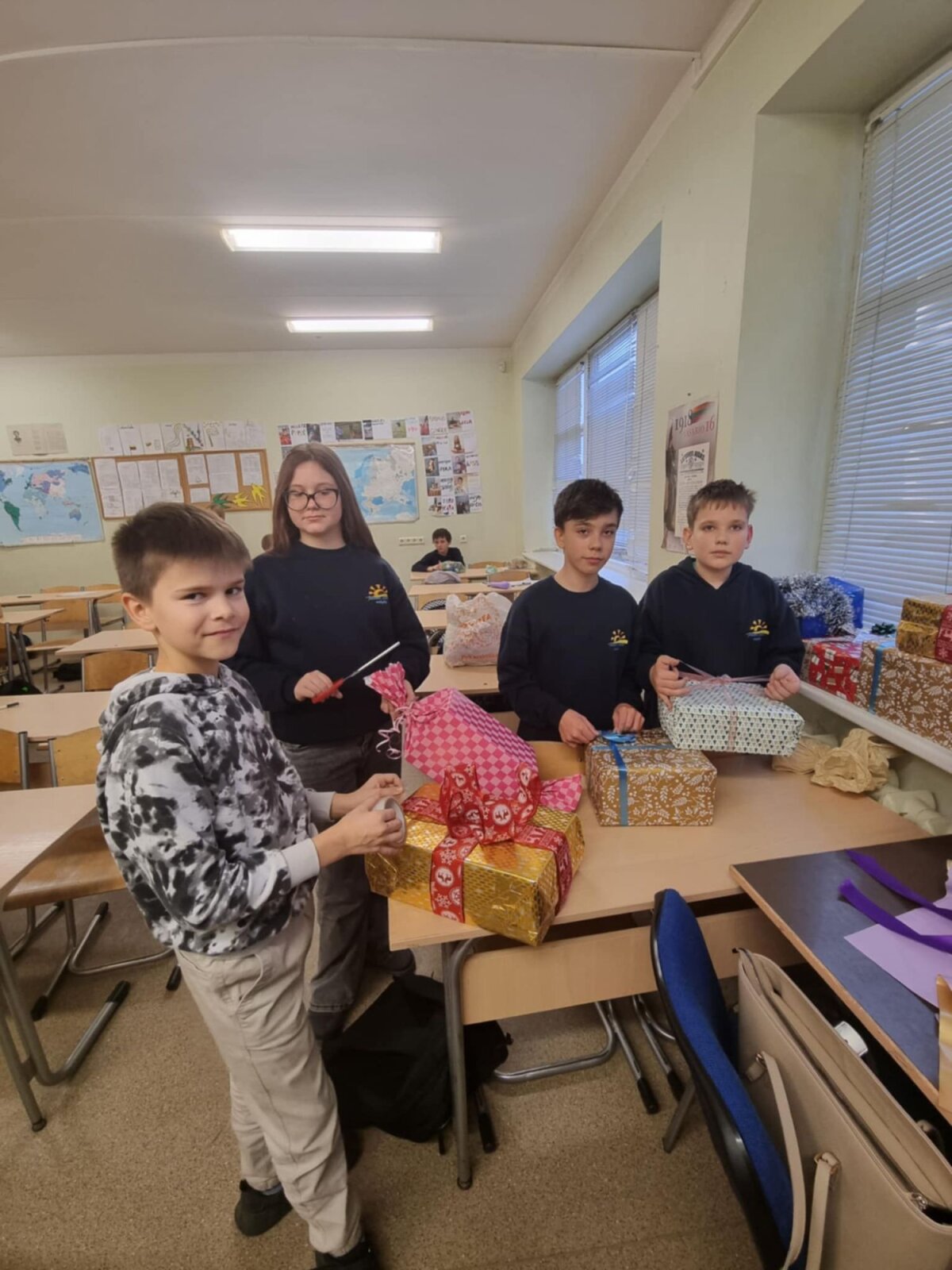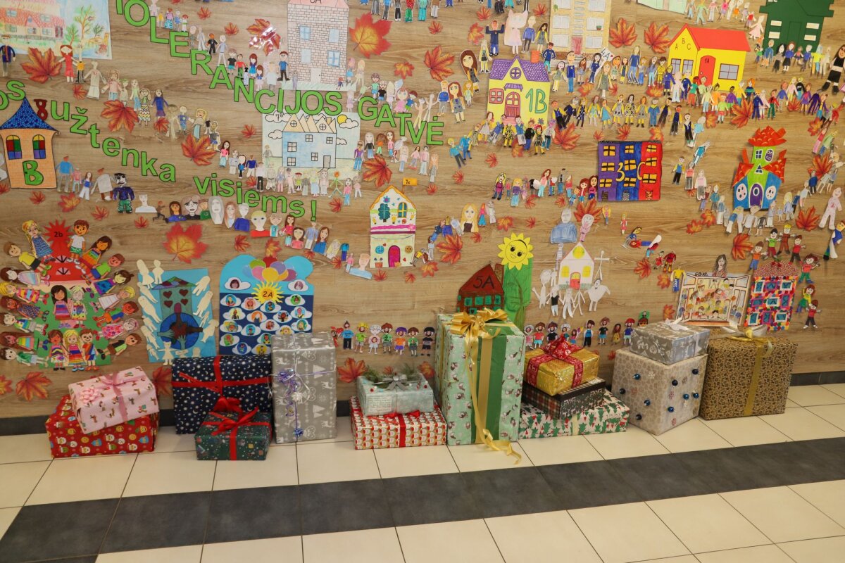 5-10 kl. ir SUS mokiniai gamino kalėdines stačiakampio formos dėžutes, jas puošė dovanų popieriumi ir užrašė linkėjimus savo mokyklai. Kalėdinėmis dovanų dėžutėmis papuošta mokyklos išorė ir vidus.