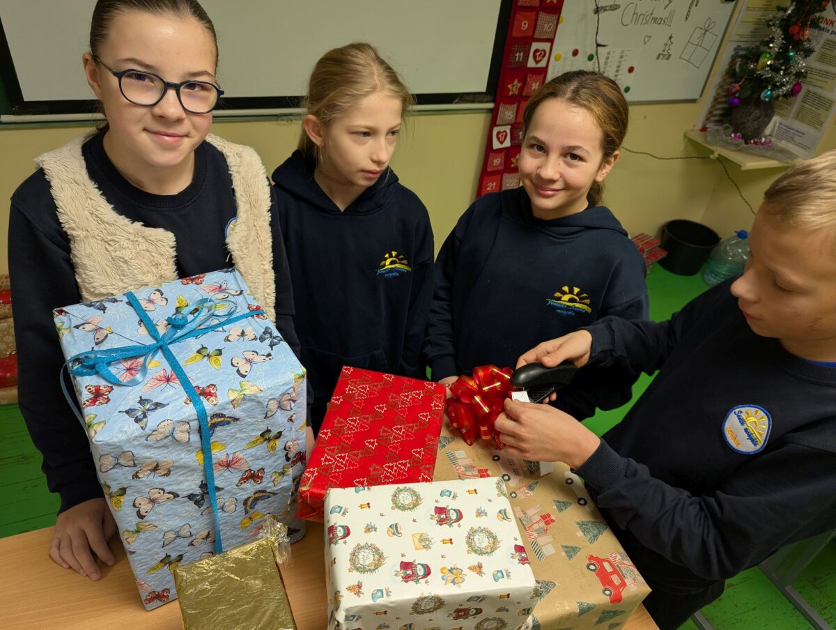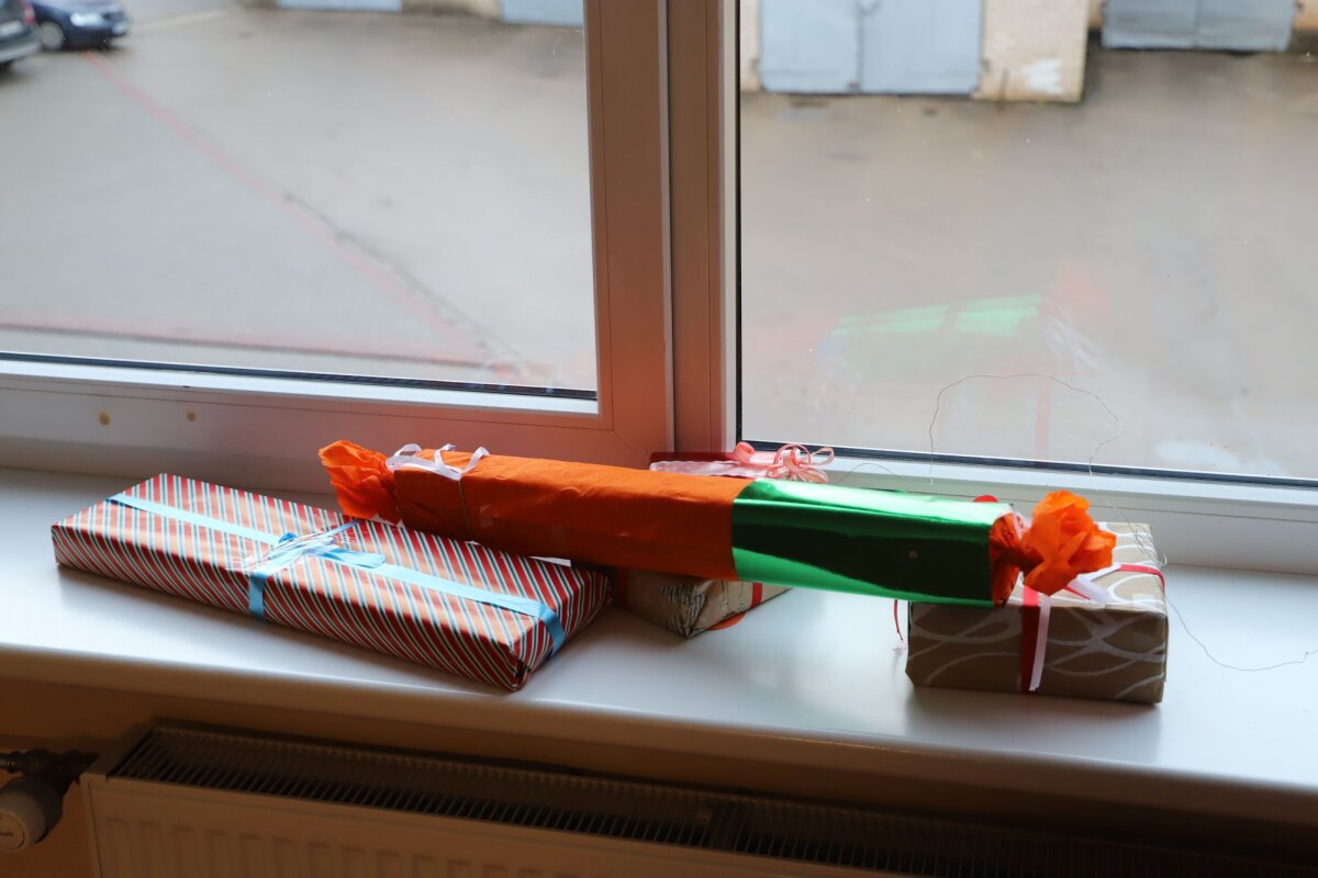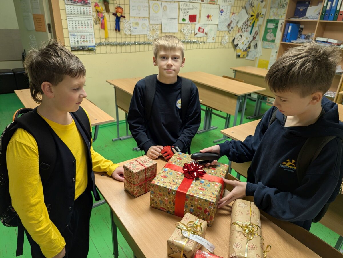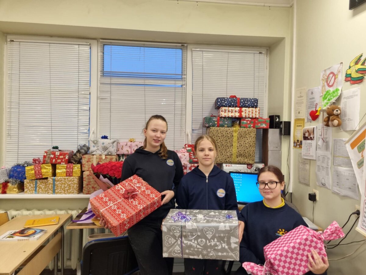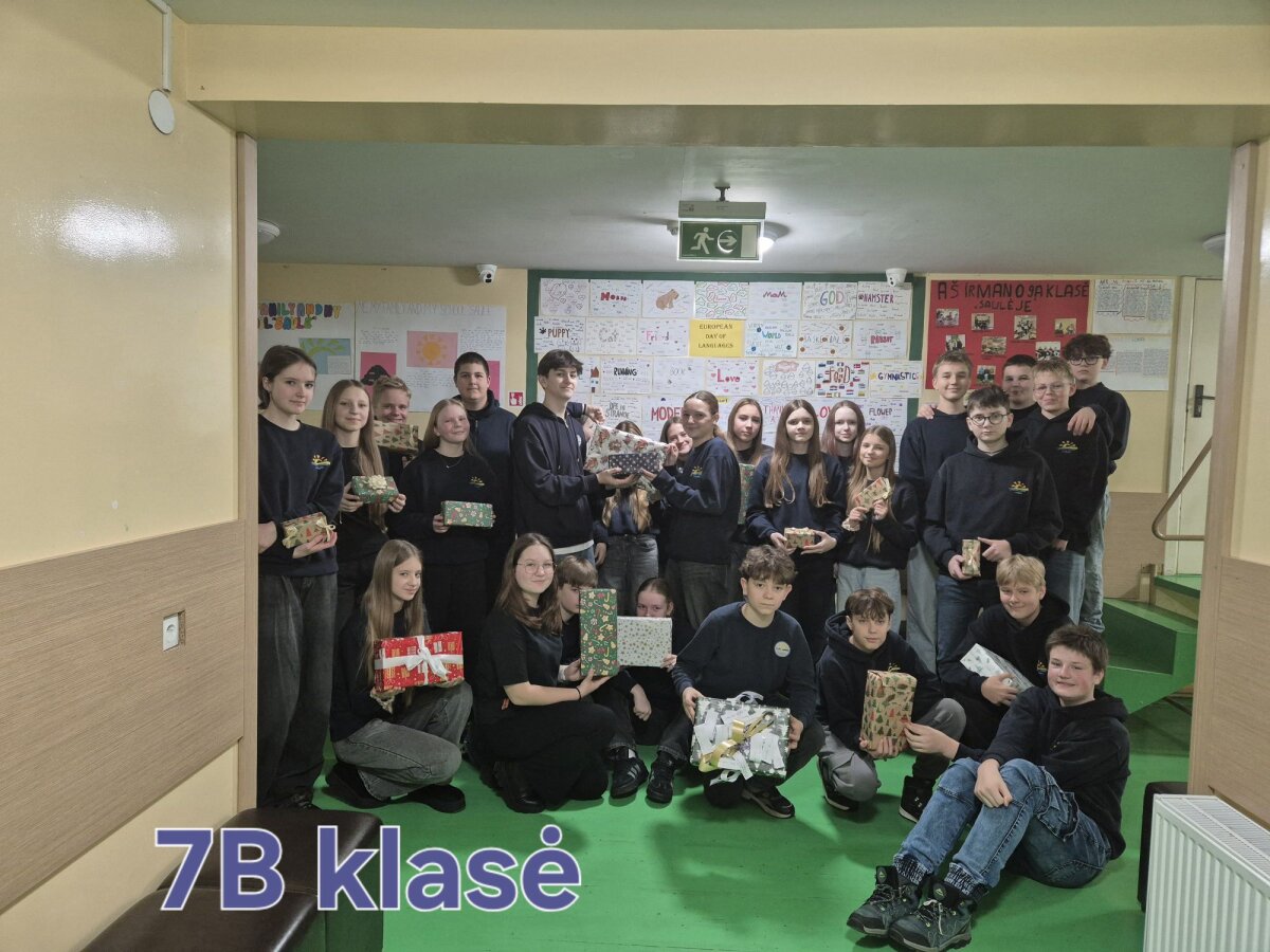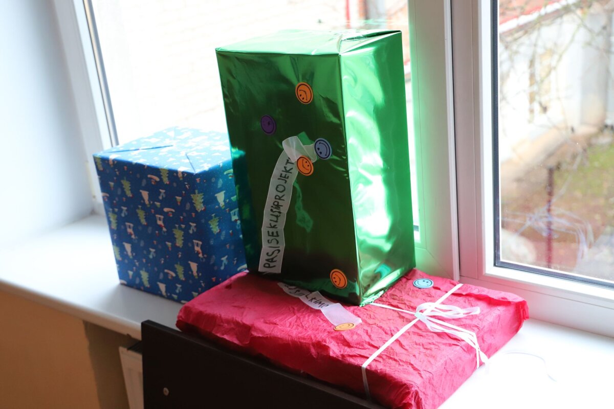 5-10 kl. ir SUS mokiniai gamino kalėdines stačiakampio formos dėžutes, jas puošė dovanų popieriumi ir užrašė linkėjimus savo mokyklai. Kalėdinėmis dovanų dėžutėmis papuošta mokyklos išorė ir vidus.