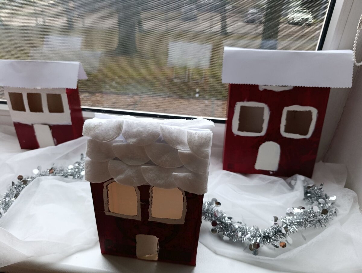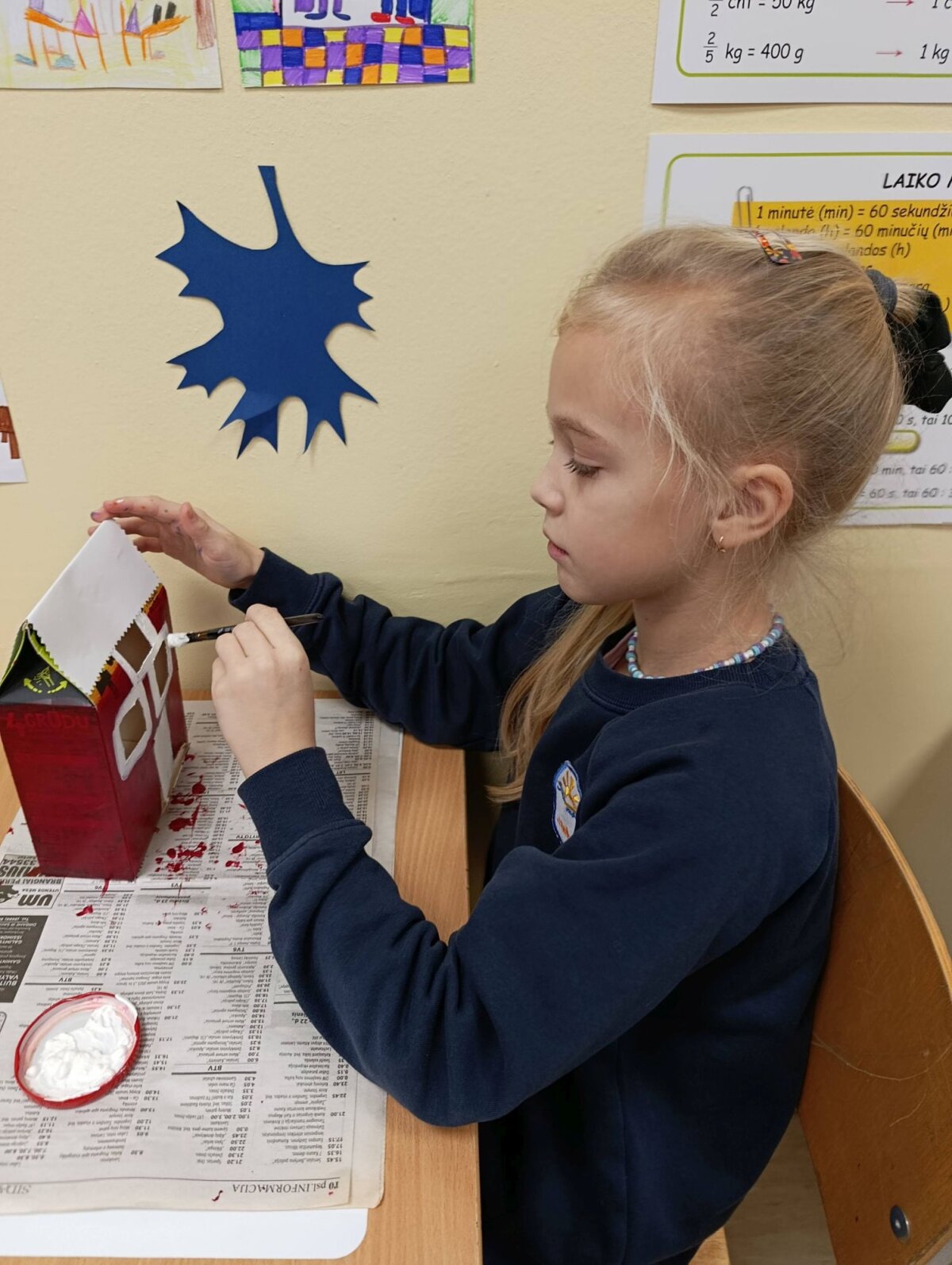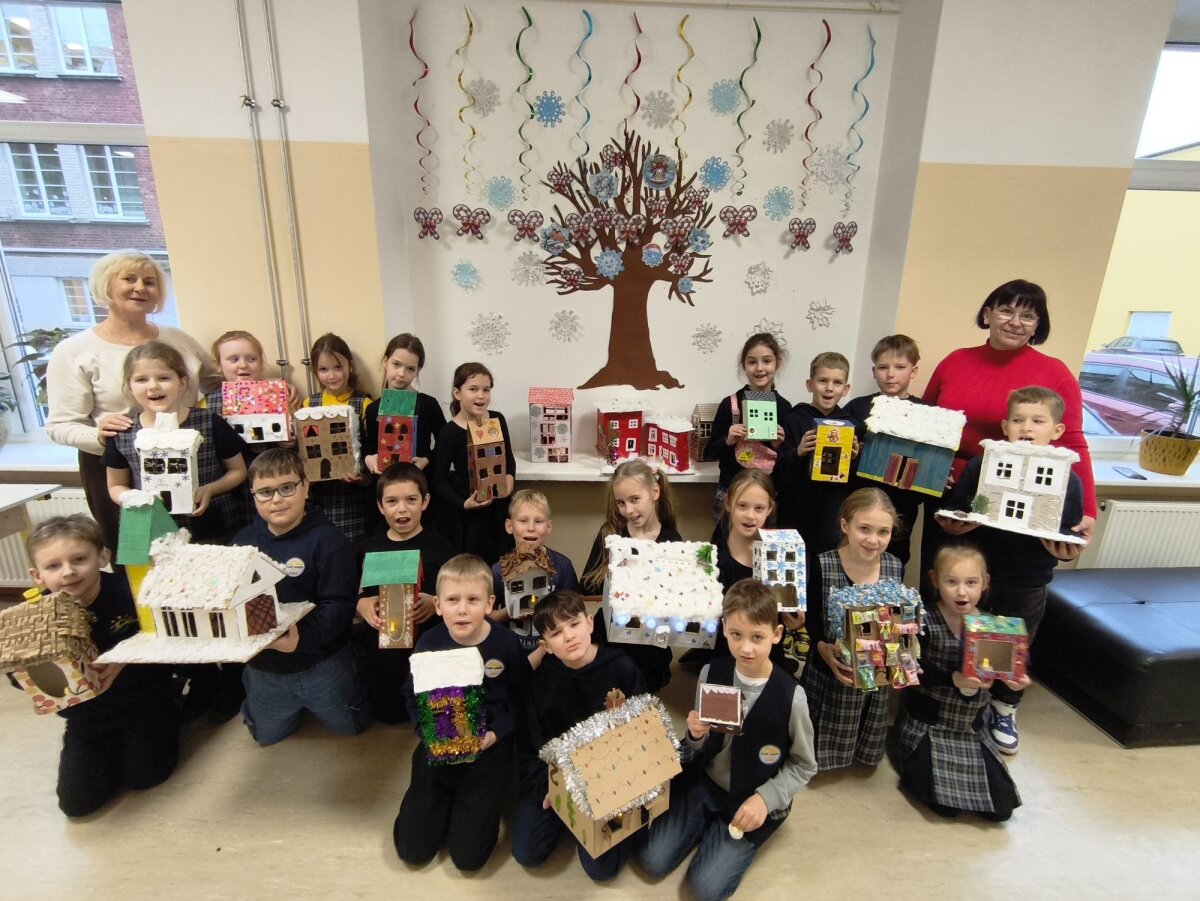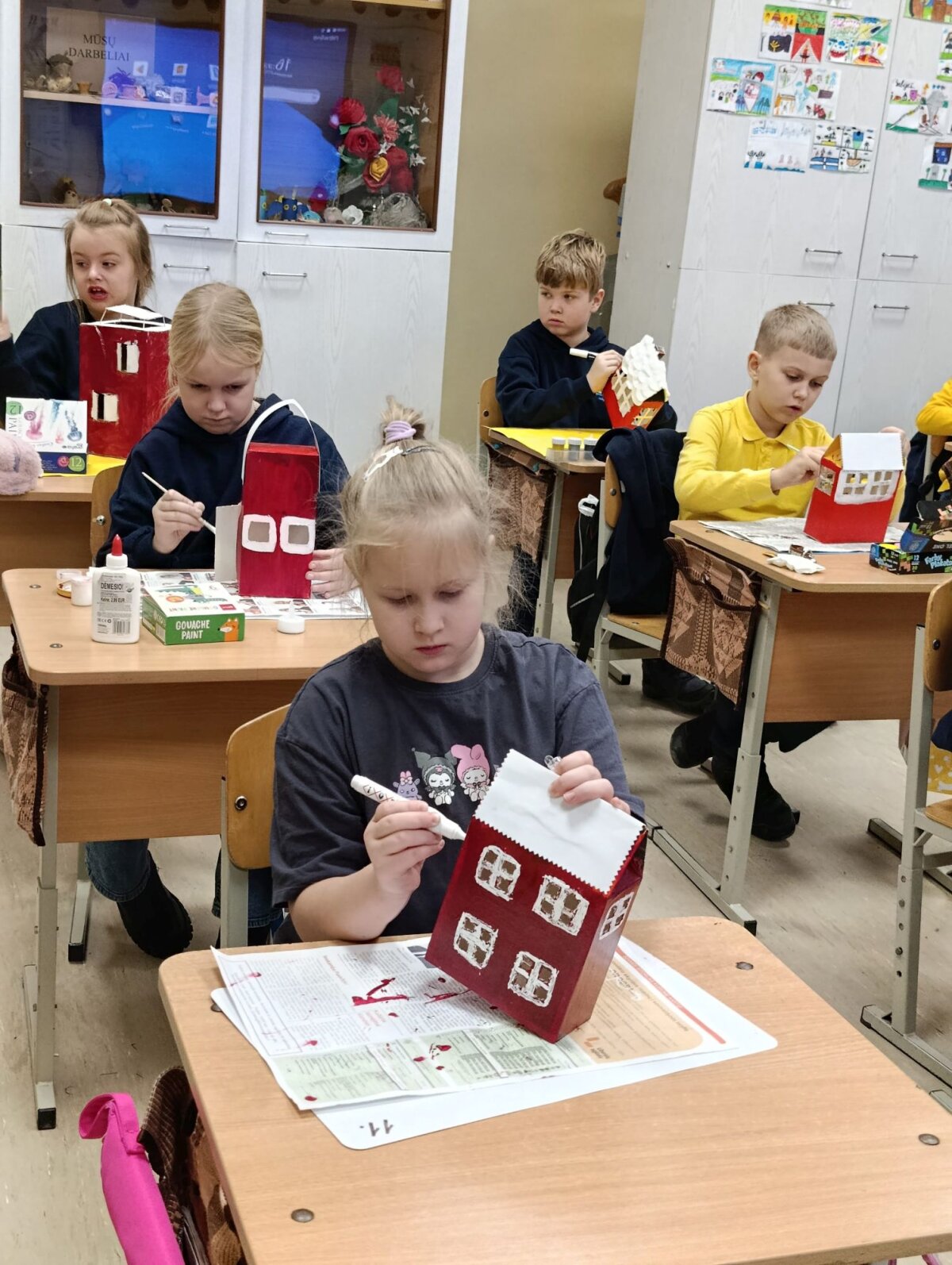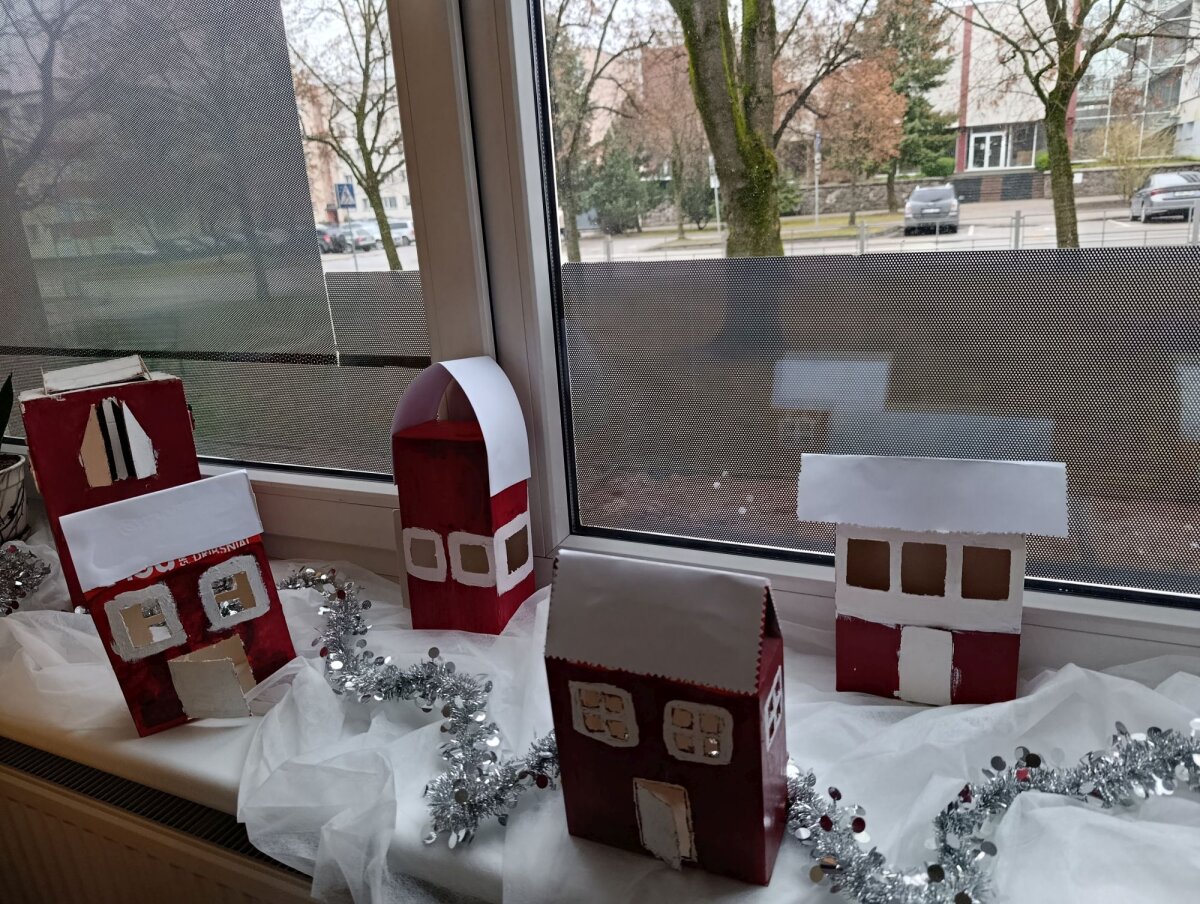 Pradinių klasių mokiniai gamino 3D namelius su kalėdiniais linkėjimais ir jais papuošė savo klases.