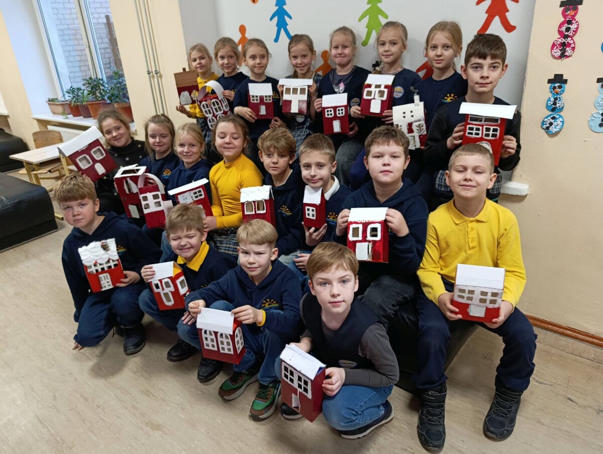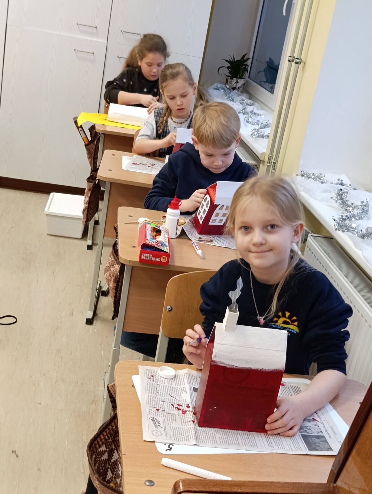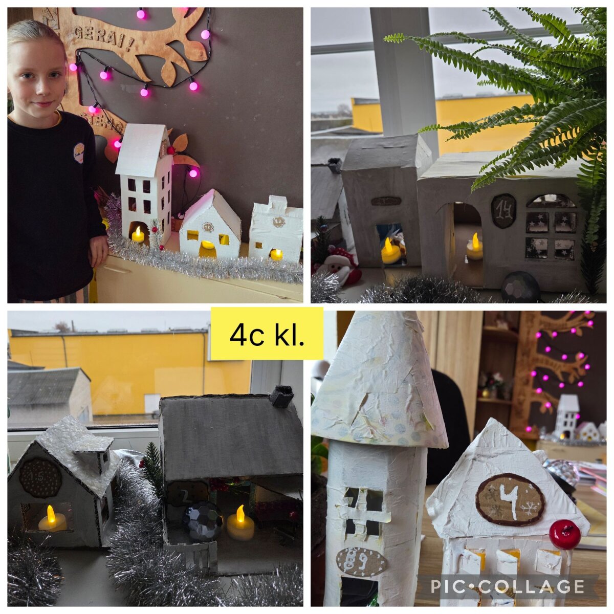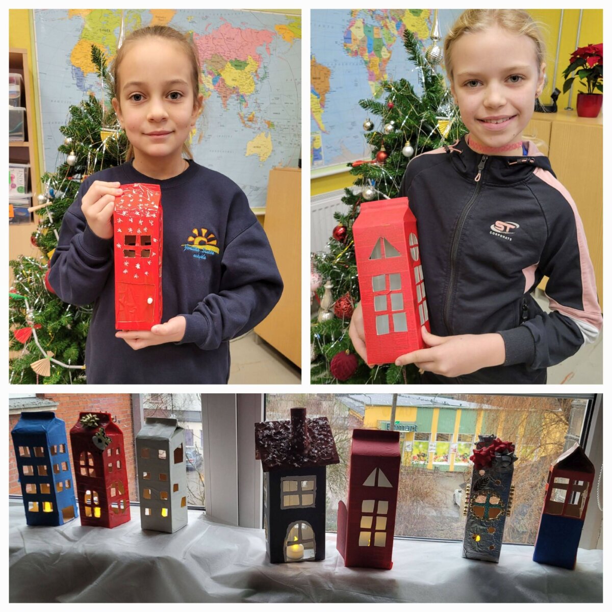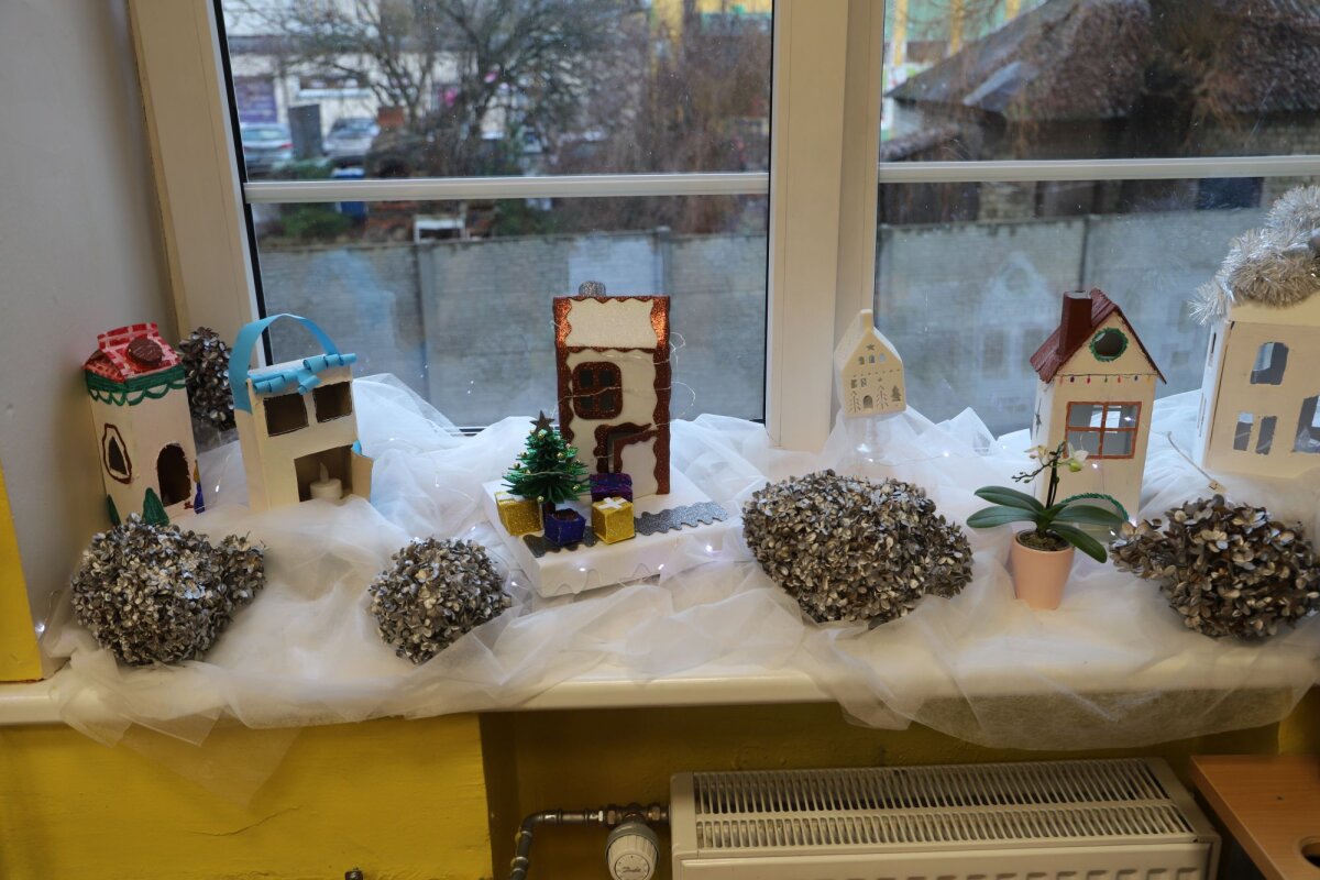 Pradinių klasių mokiniai gamino 3D namelius su kalėdiniais linkėjimais ir jais papuošė savo klases.