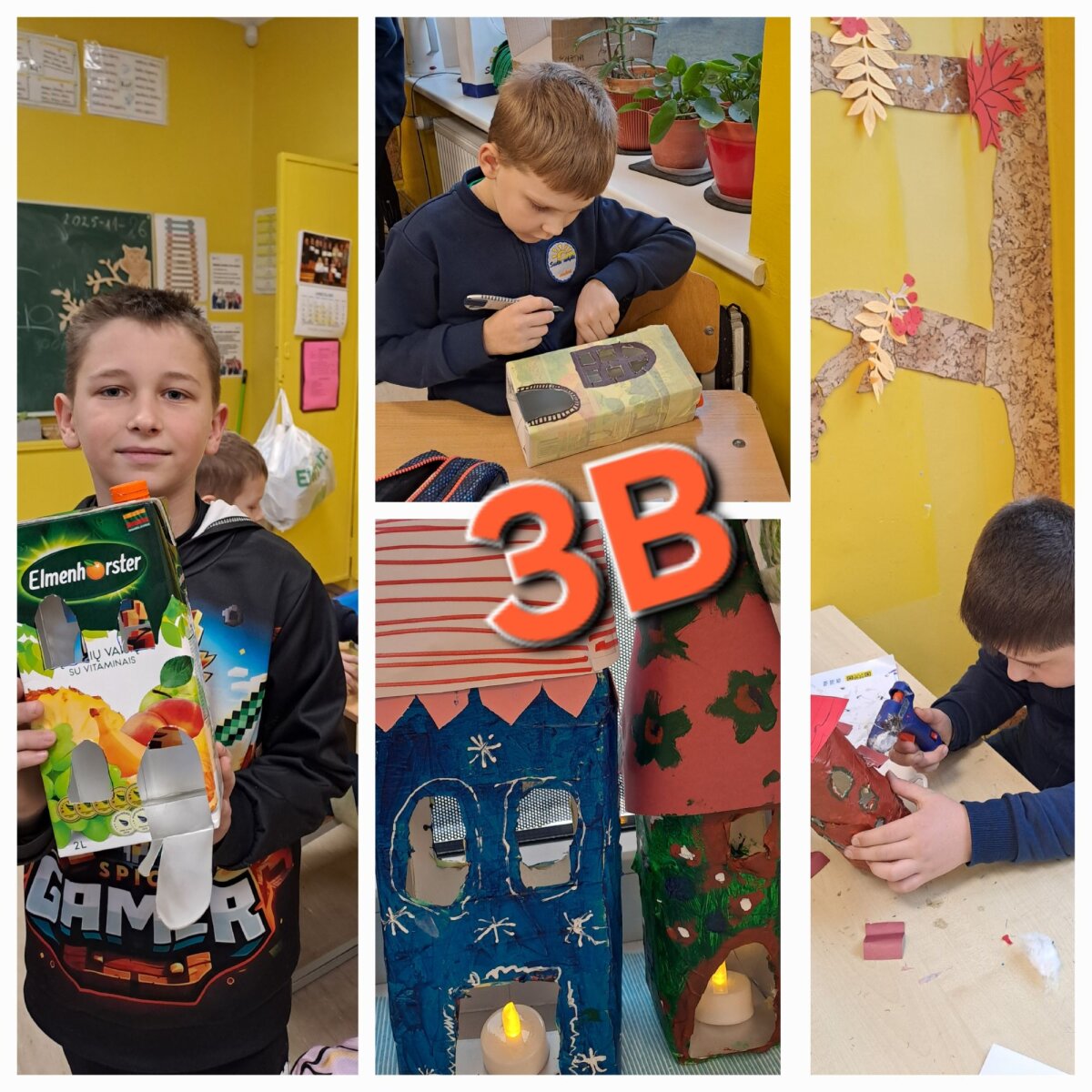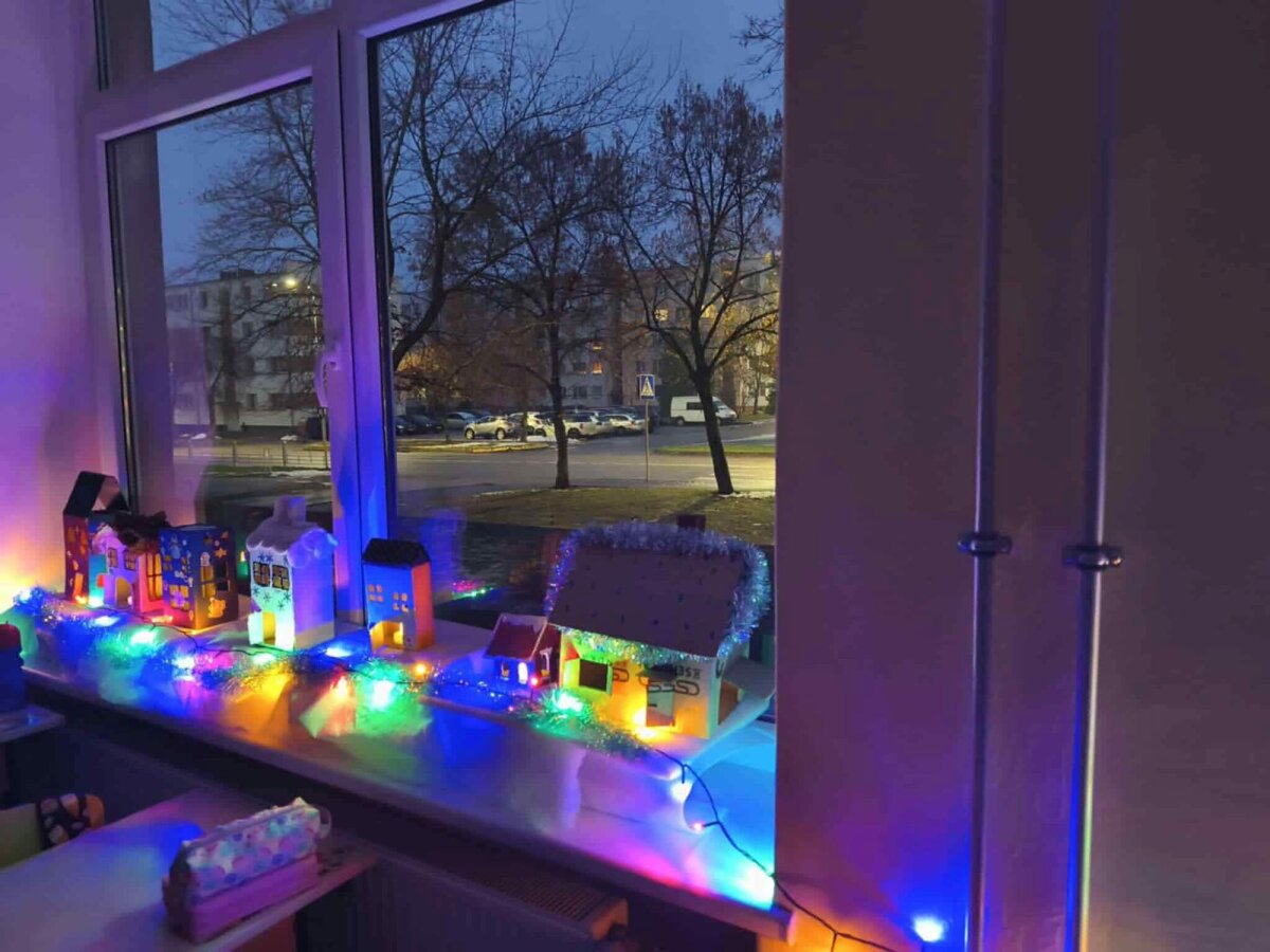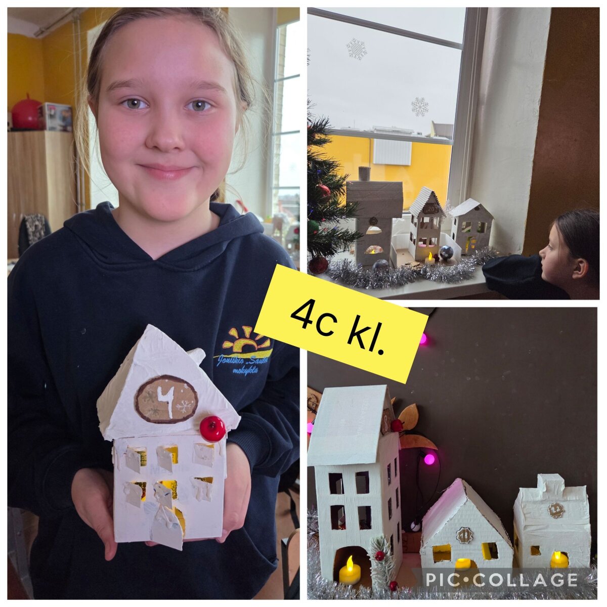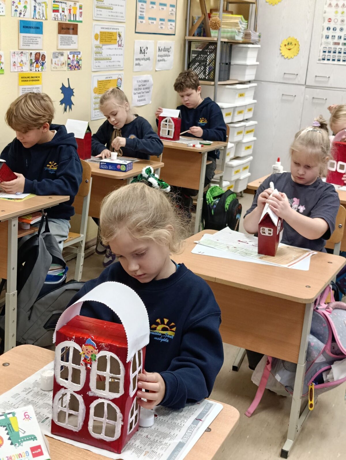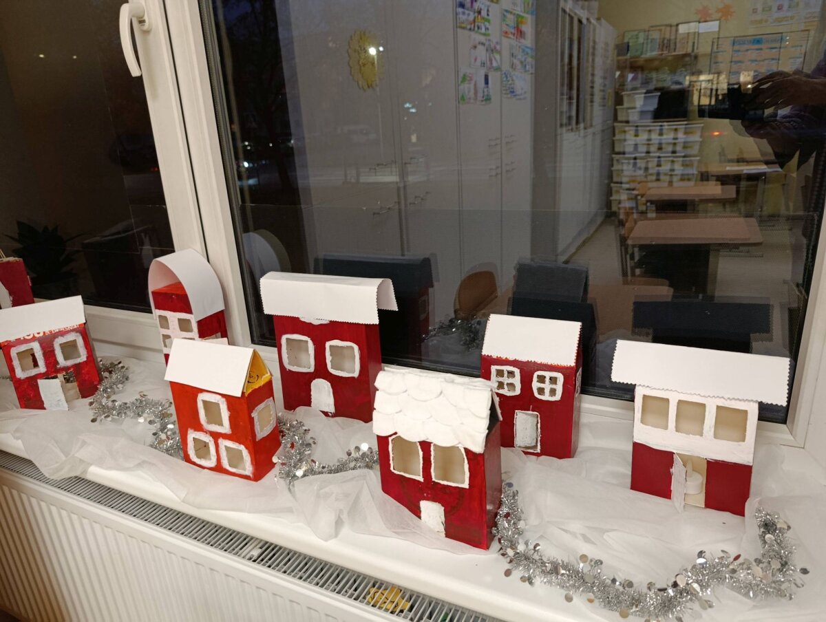Pradinių klasių mokiniai gamino 3D namelius su kalėdiniais linkėjimais ir jais papuošė savo klases.