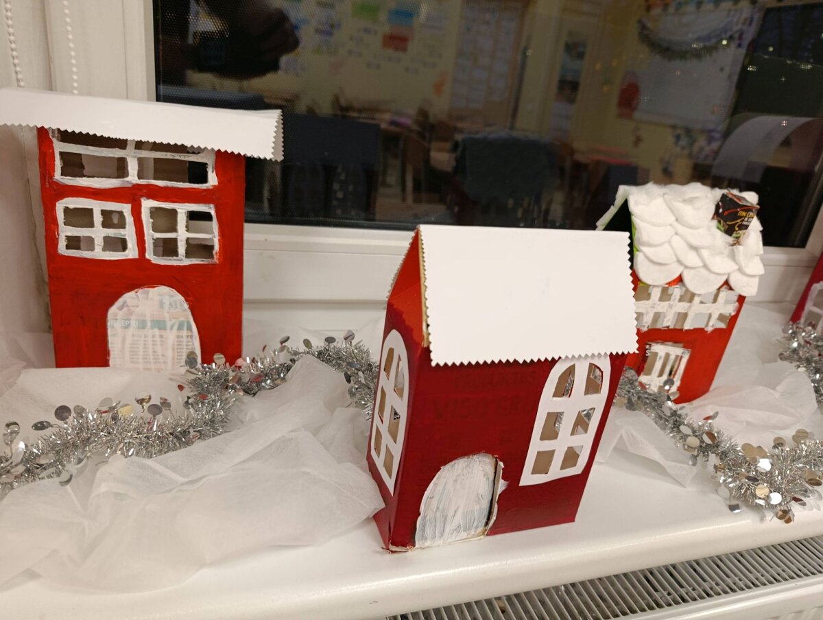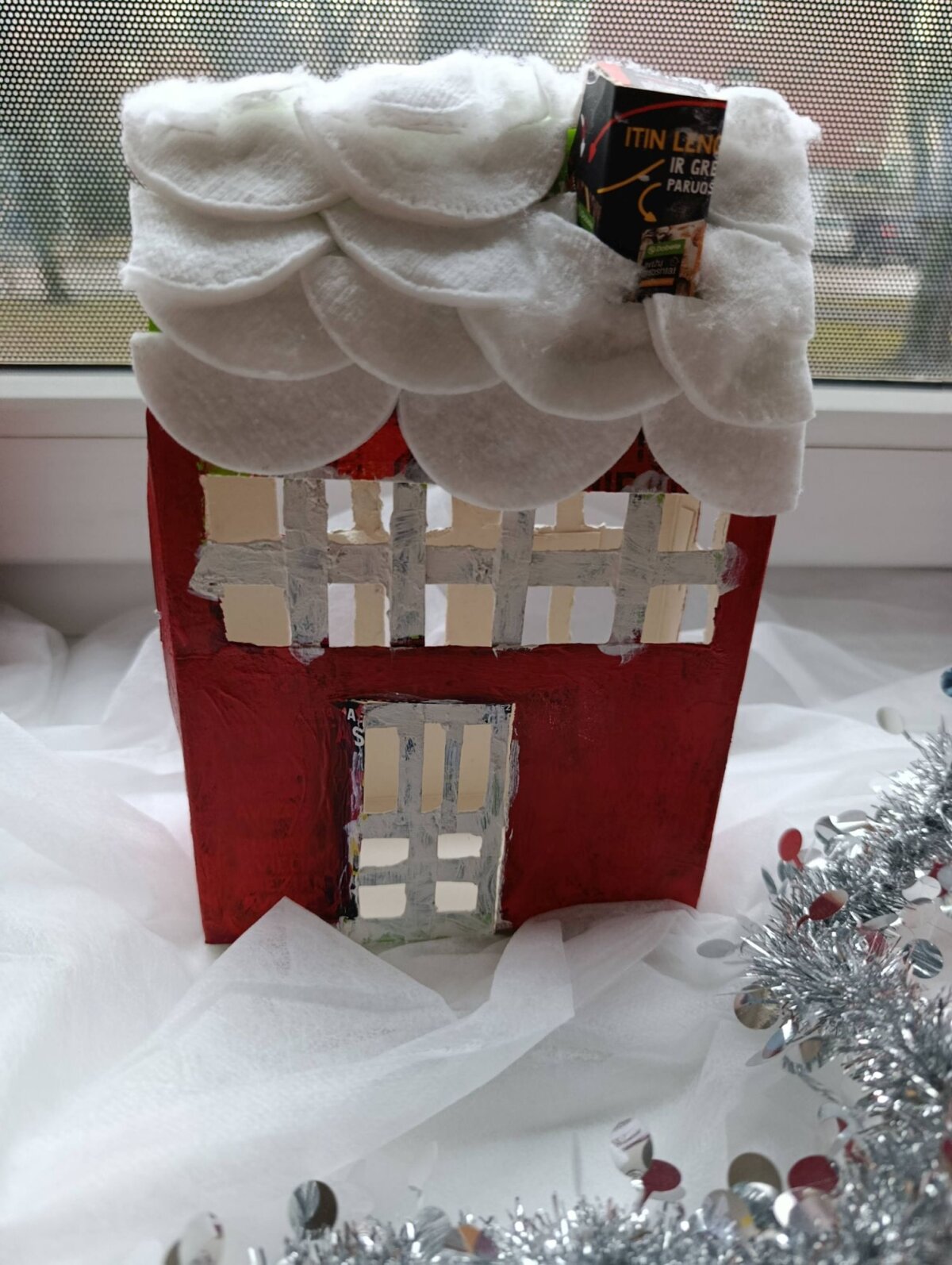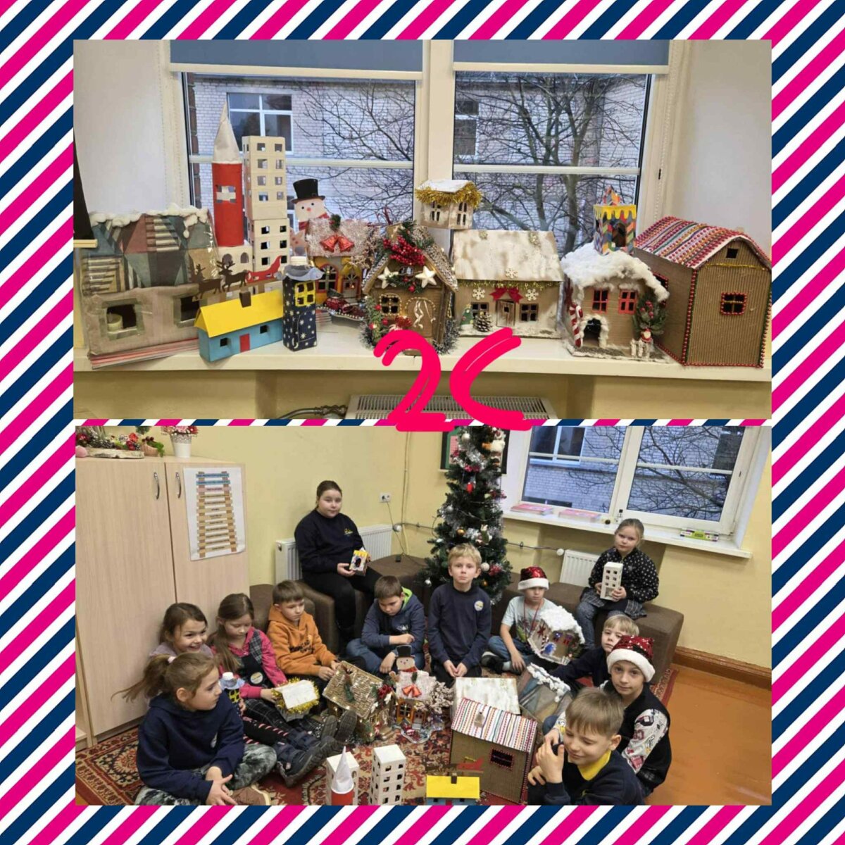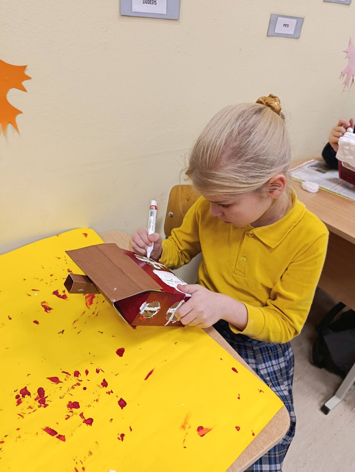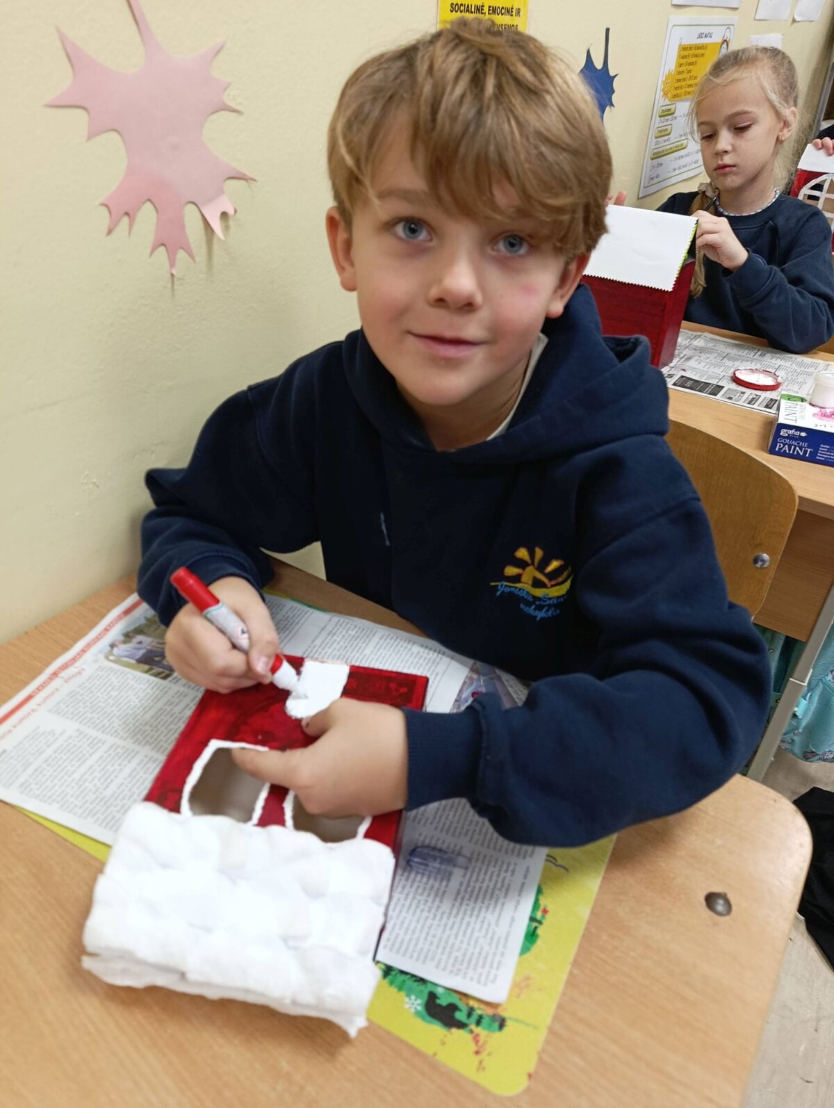 Pradinių klasių mokiniai gamino 3D namelius su kalėdiniais linkėjimais ir jais papuošė savo klases.