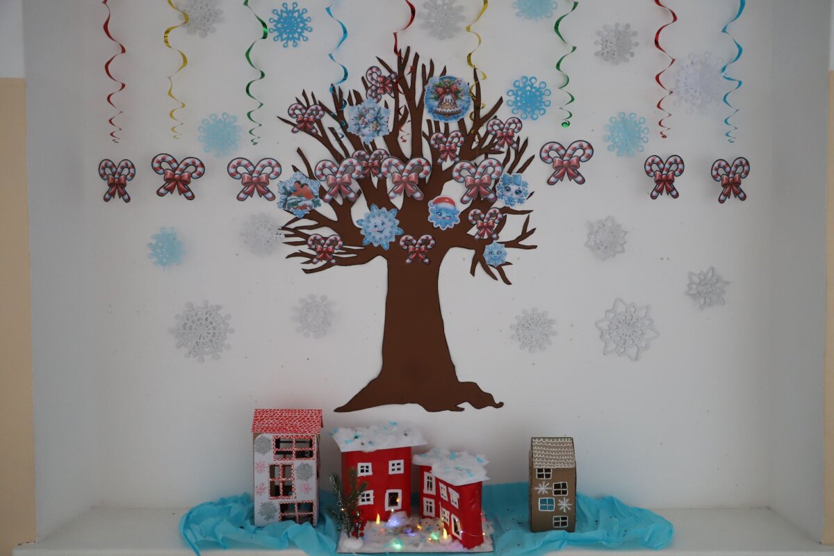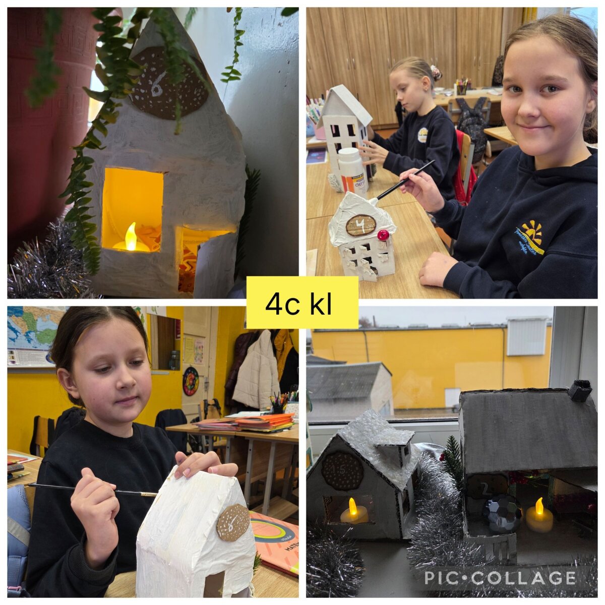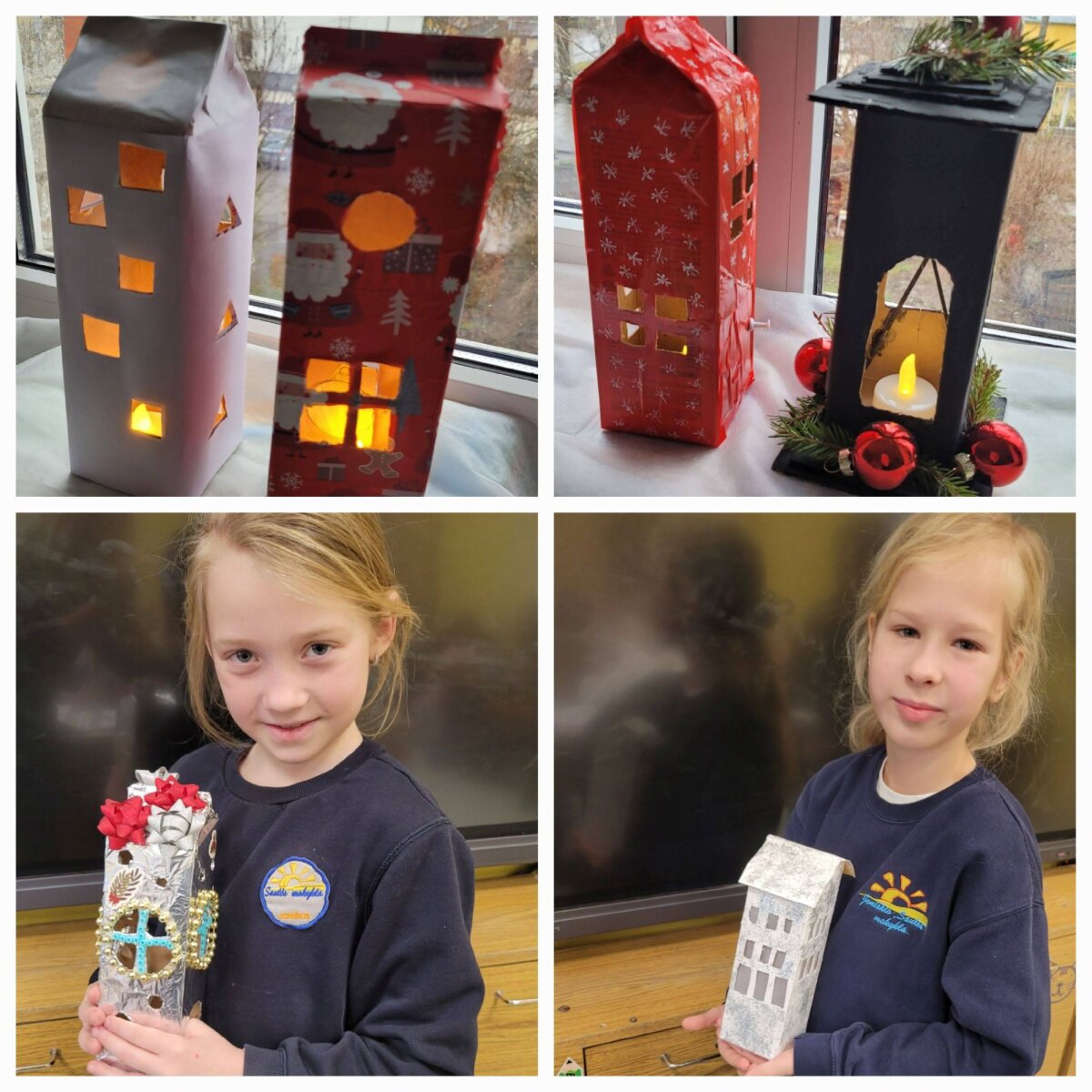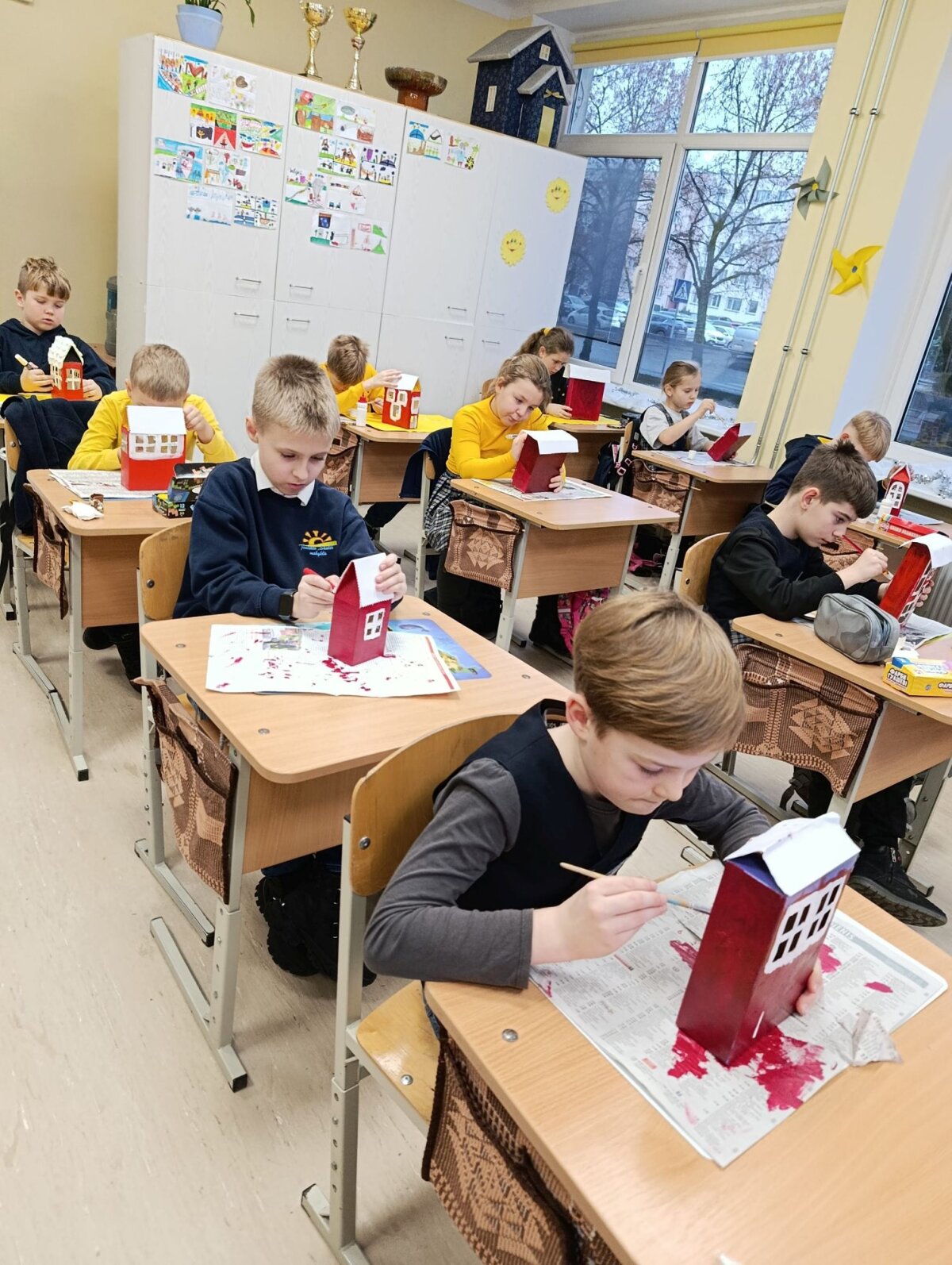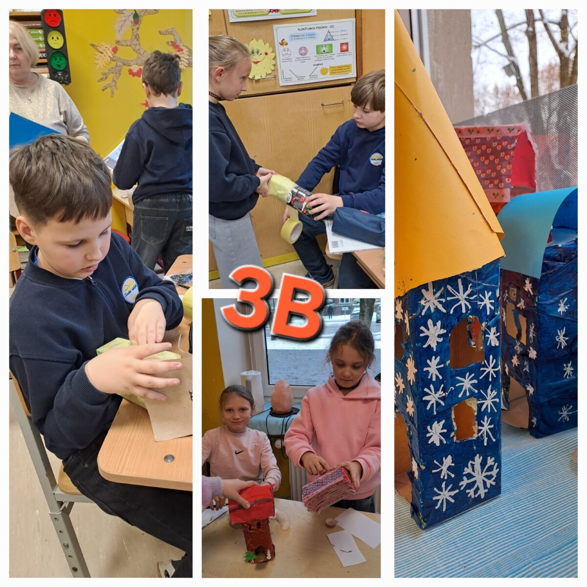 Pradinių klasių mokiniai gamino 3D namelius su kalėdiniais linkėjimais ir jais papuošė savo klases.