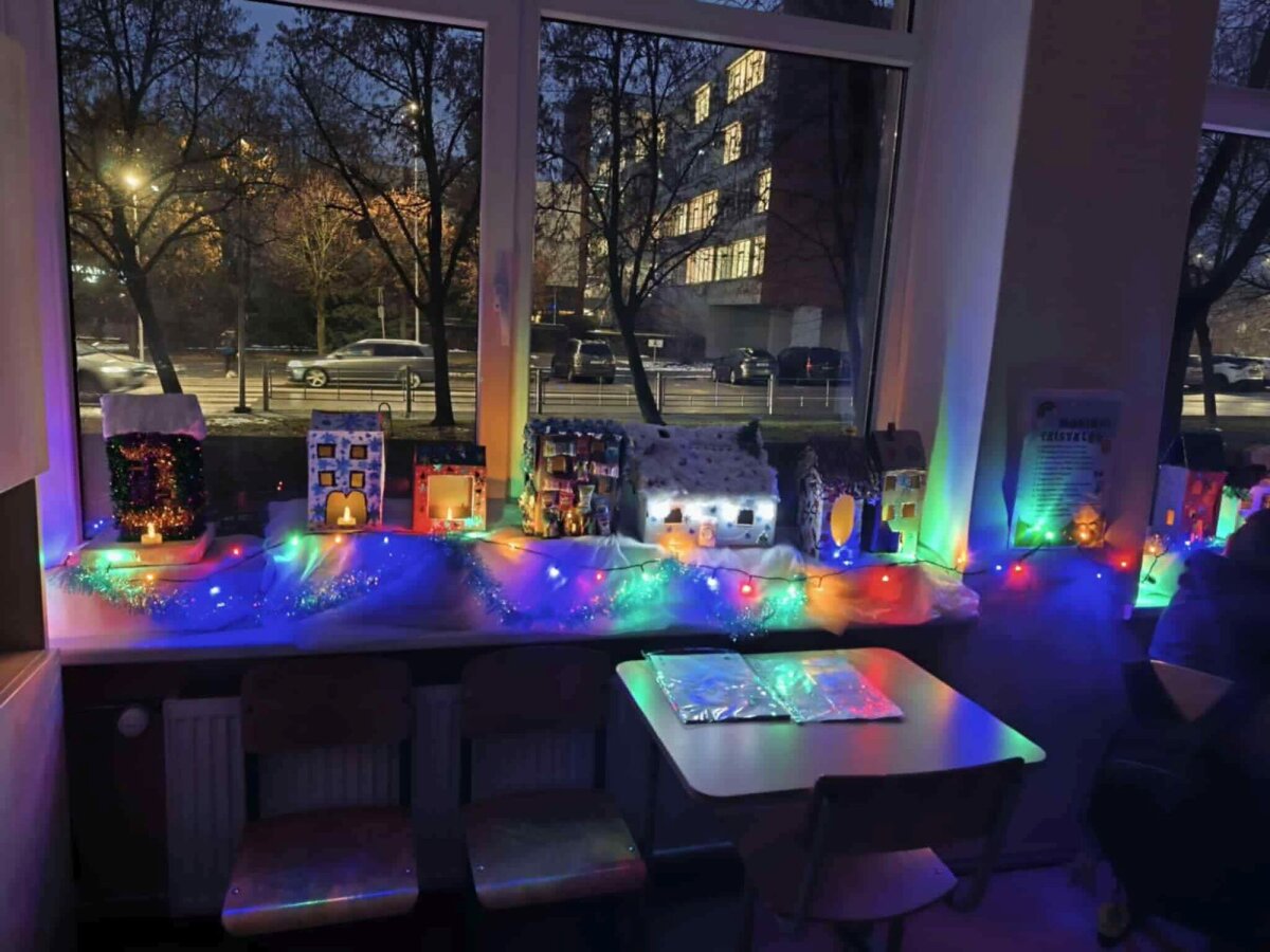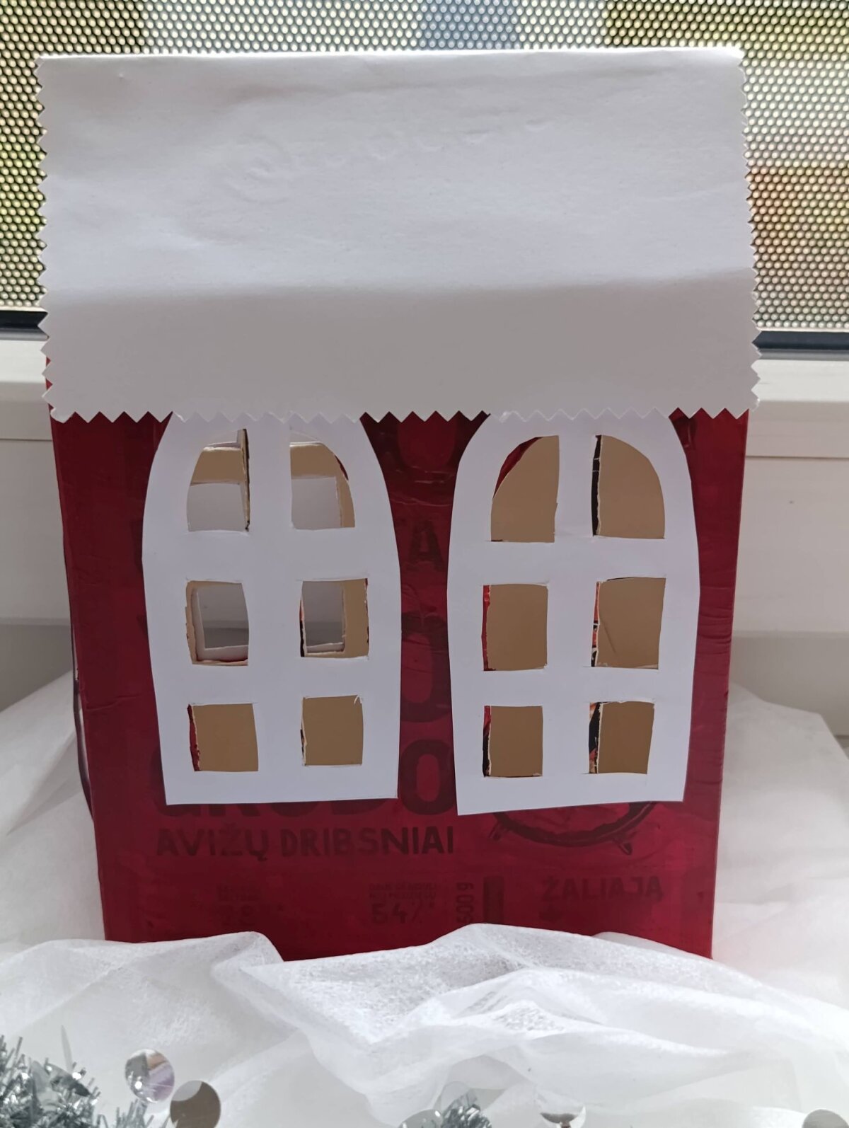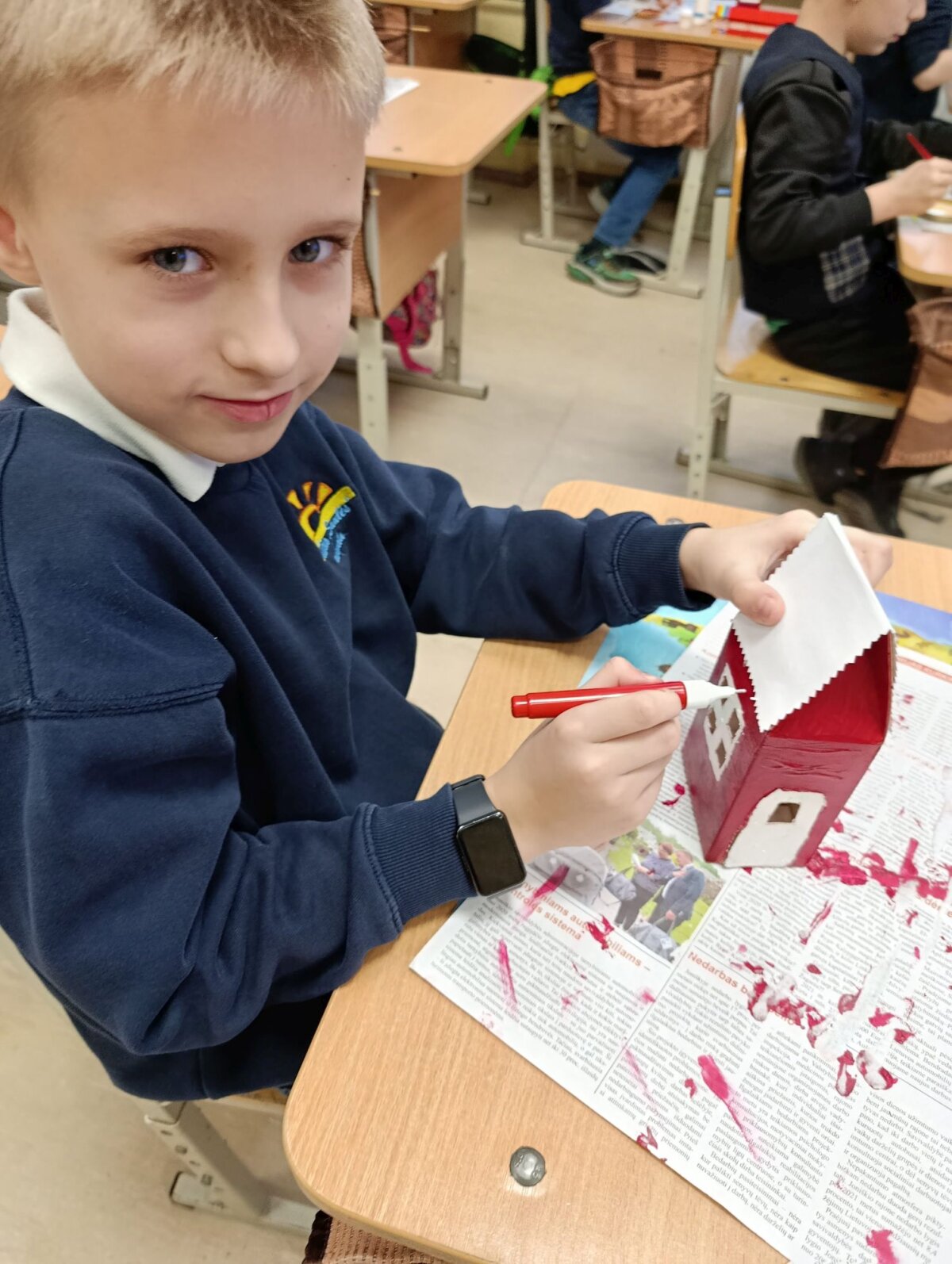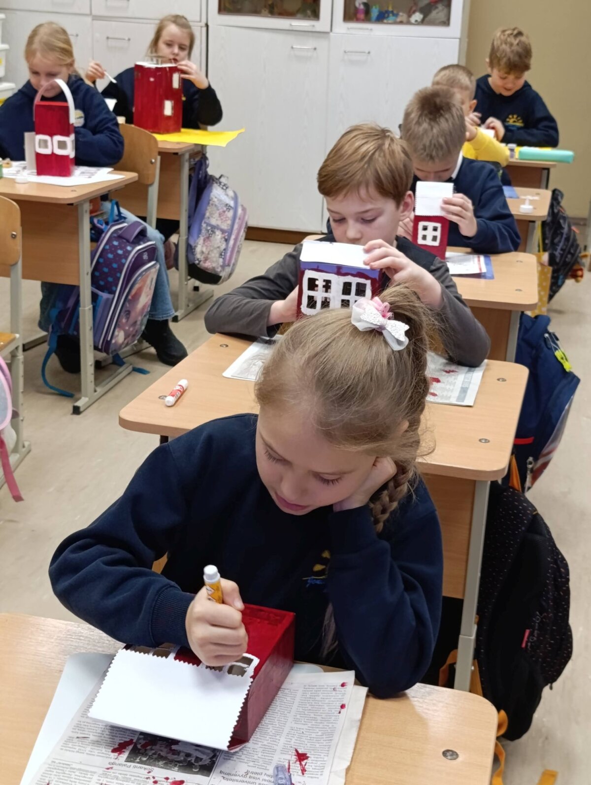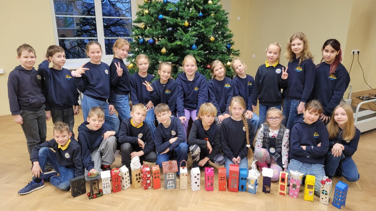 Pradinių klasių mokiniai gamino 3D namelius su kalėdiniais linkėjimais ir jais papuošė savo klases.