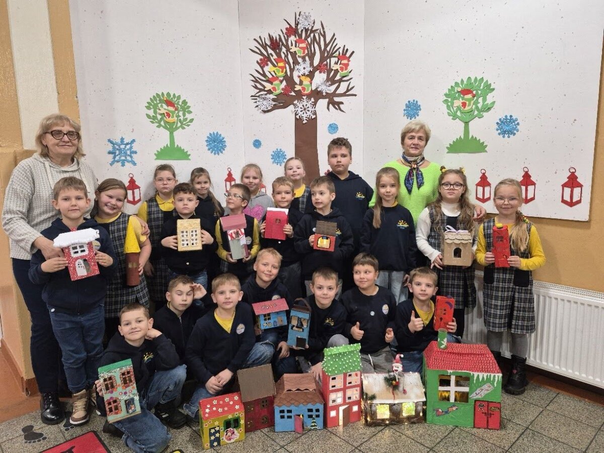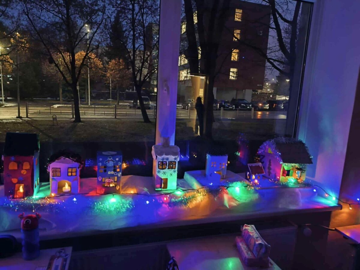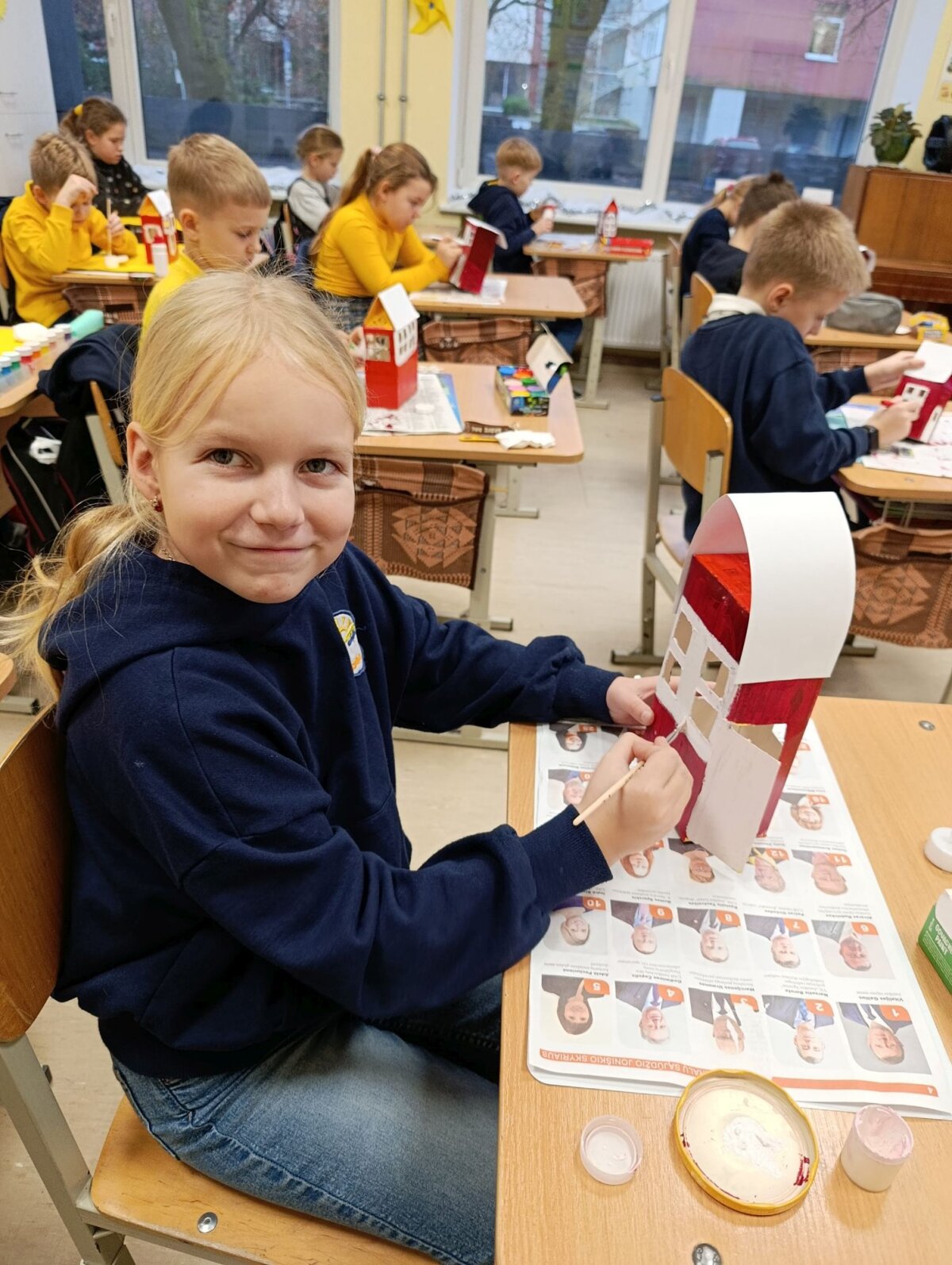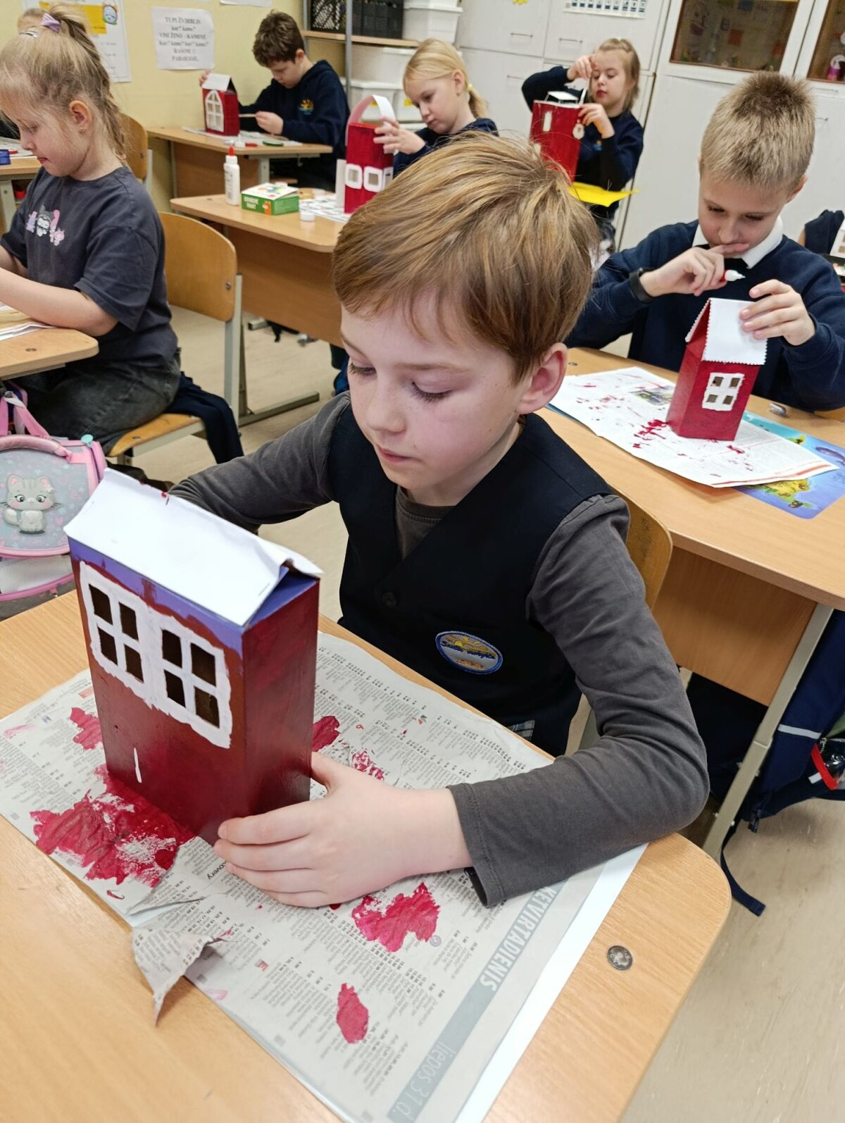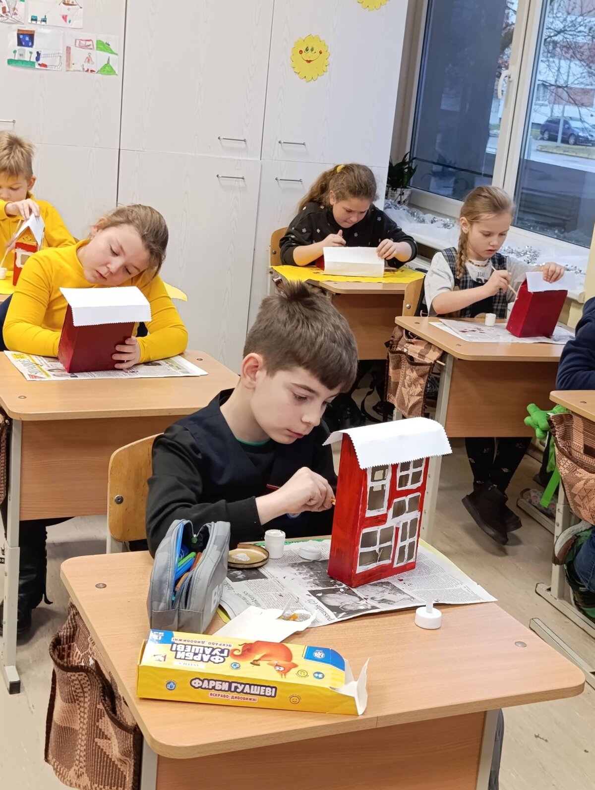 Pradinių klasių mokiniai gamino 3D namelius su kalėdiniais linkėjimais ir jais papuošė savo klases.