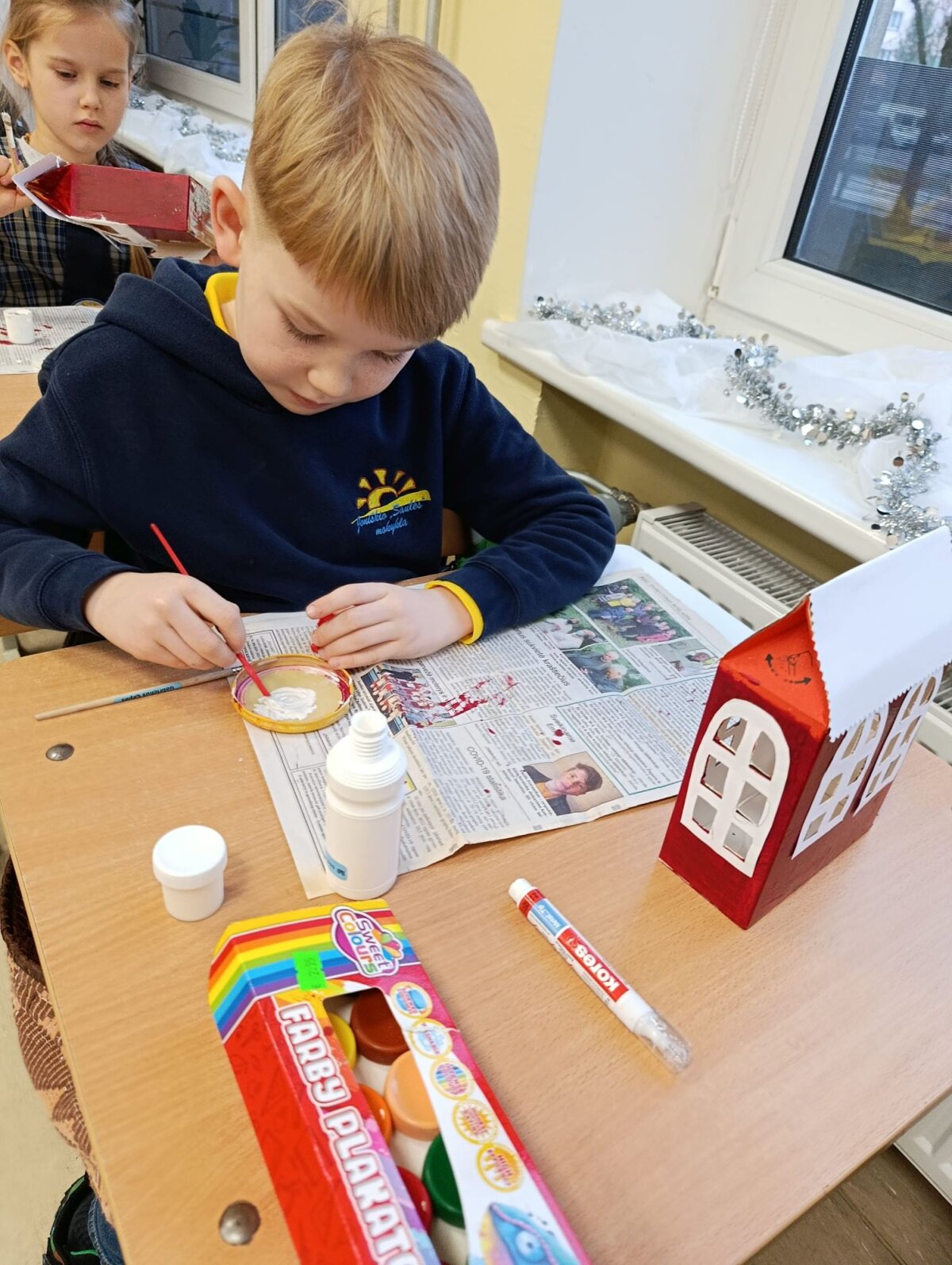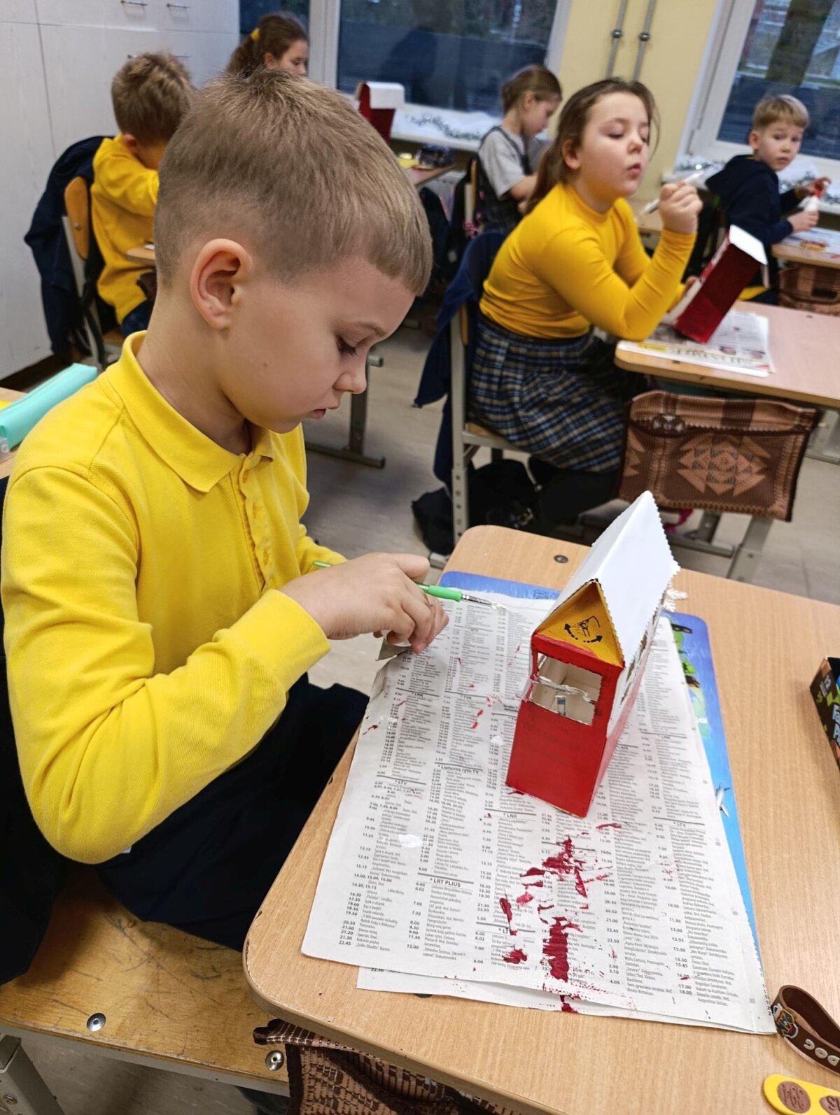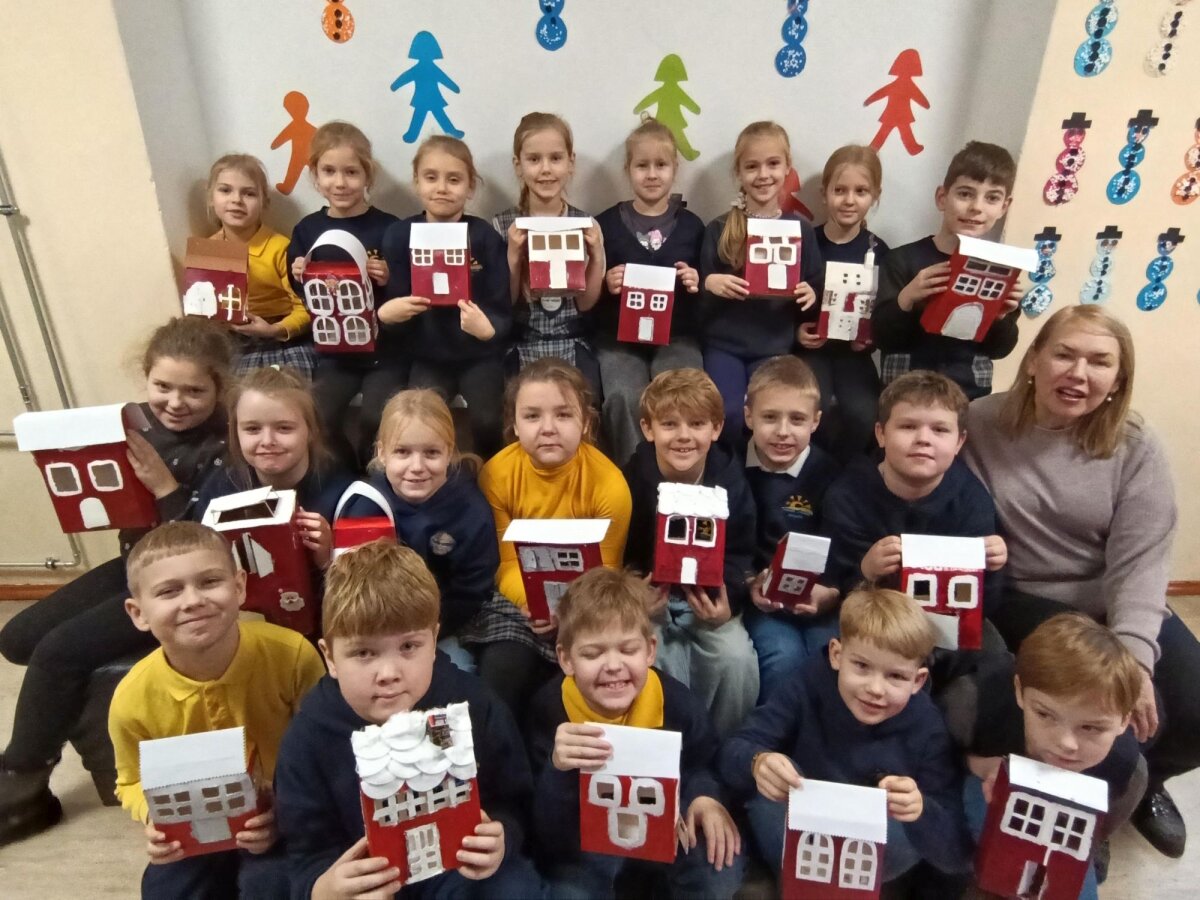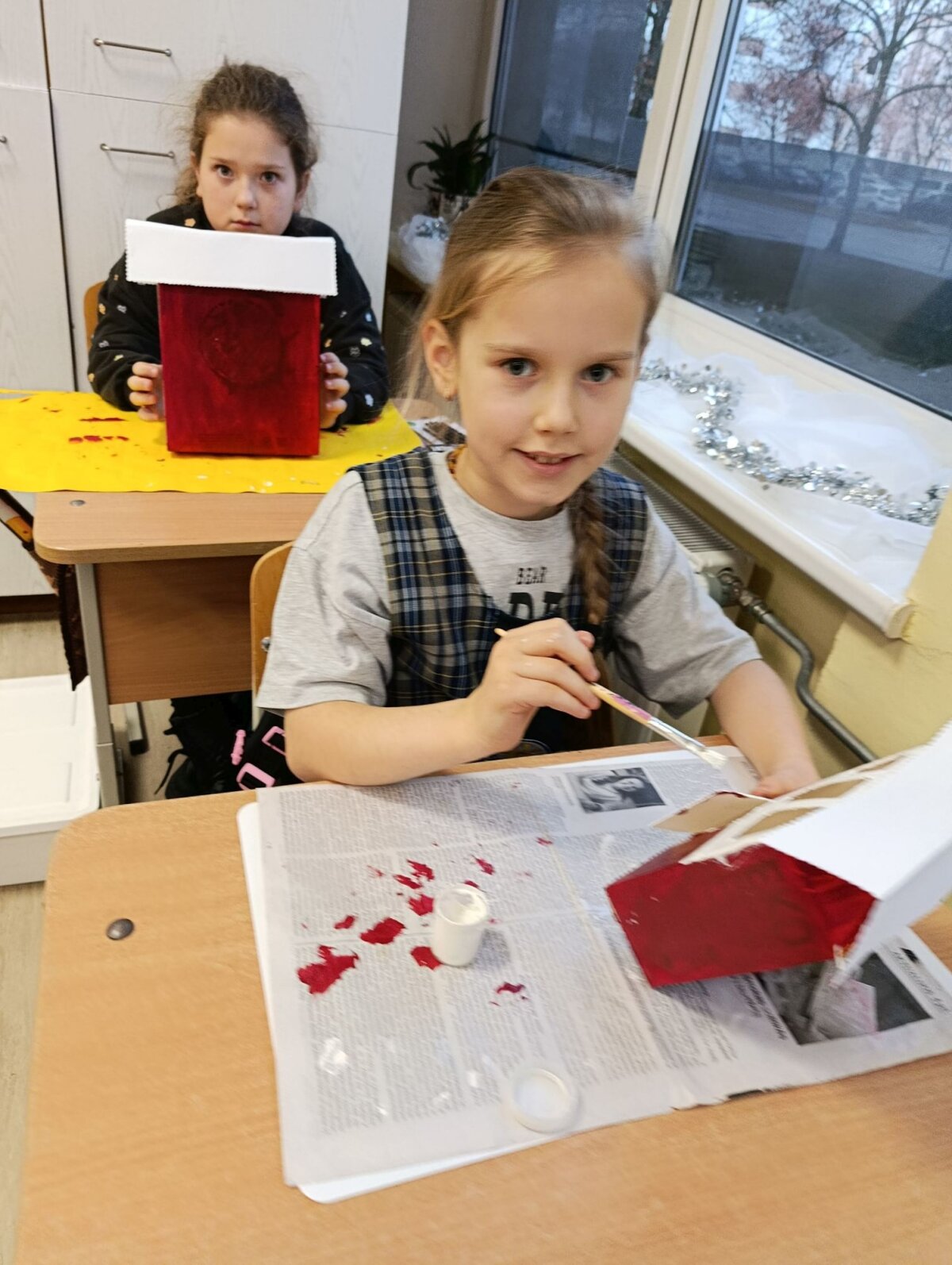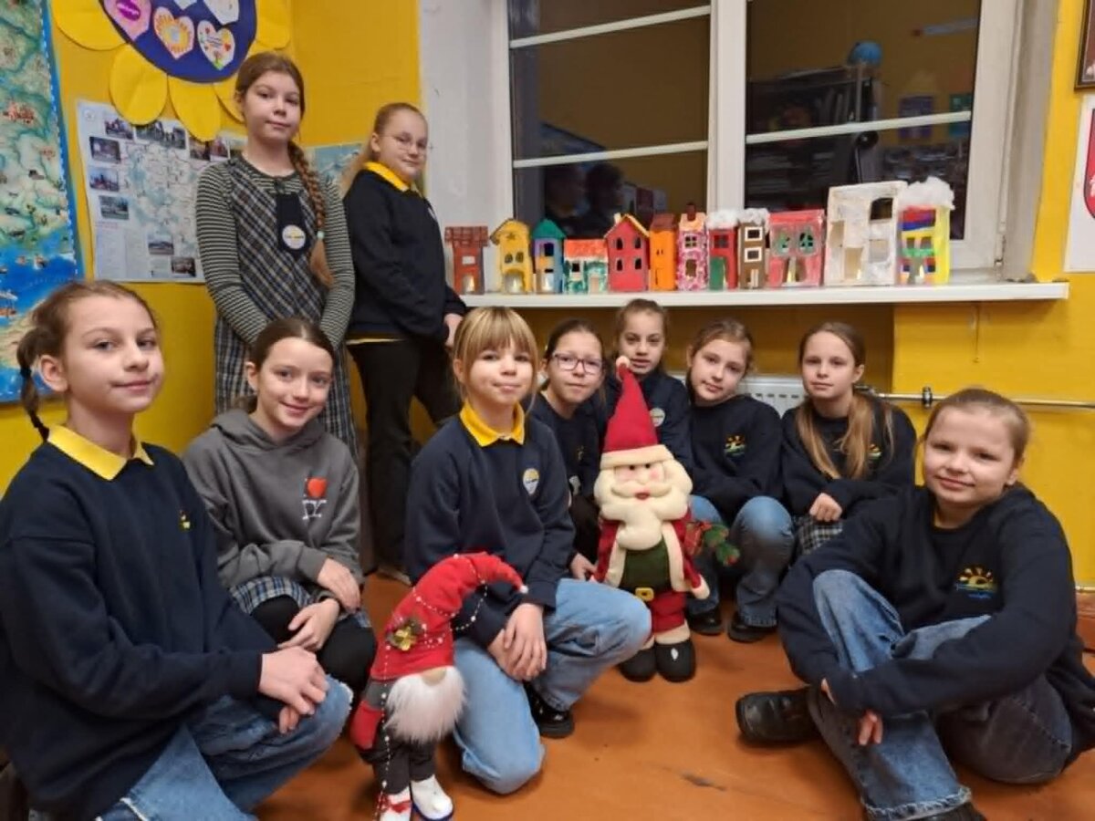 Pradinių klasių mokiniai gamino 3D namelius su kalėdiniais linkėjimais ir jais papuošė savo klases.