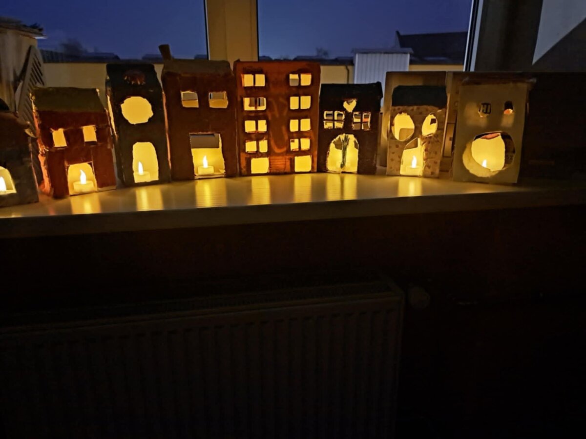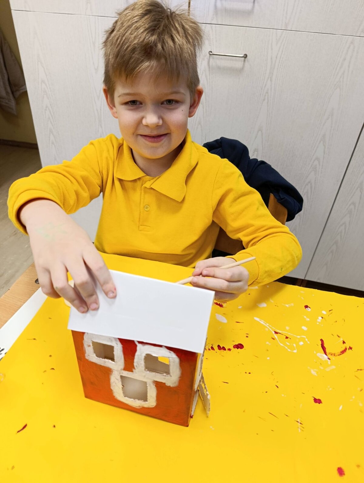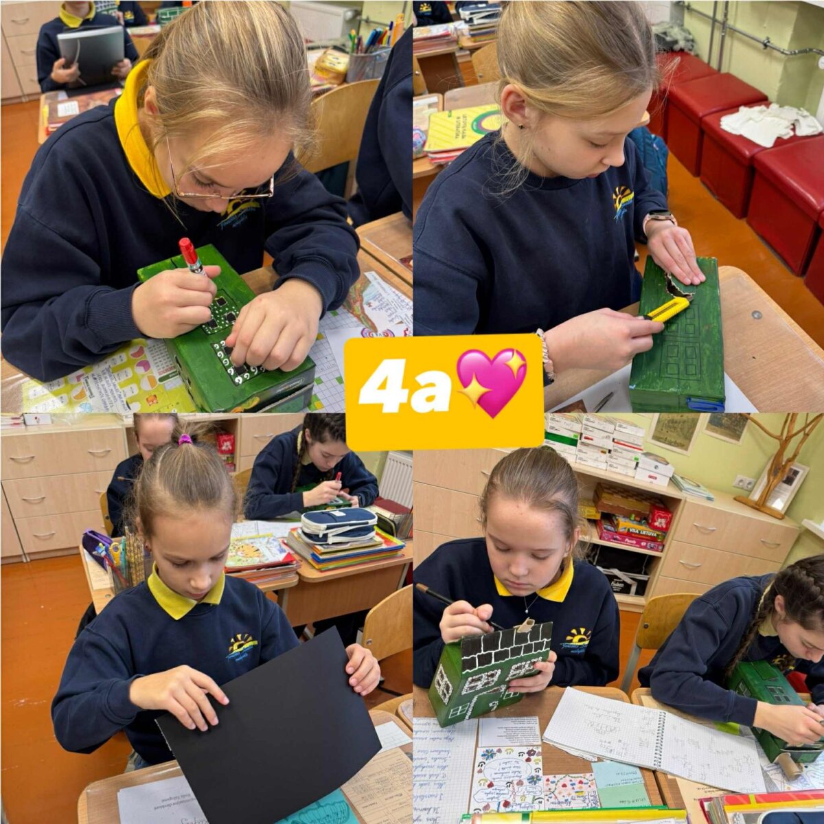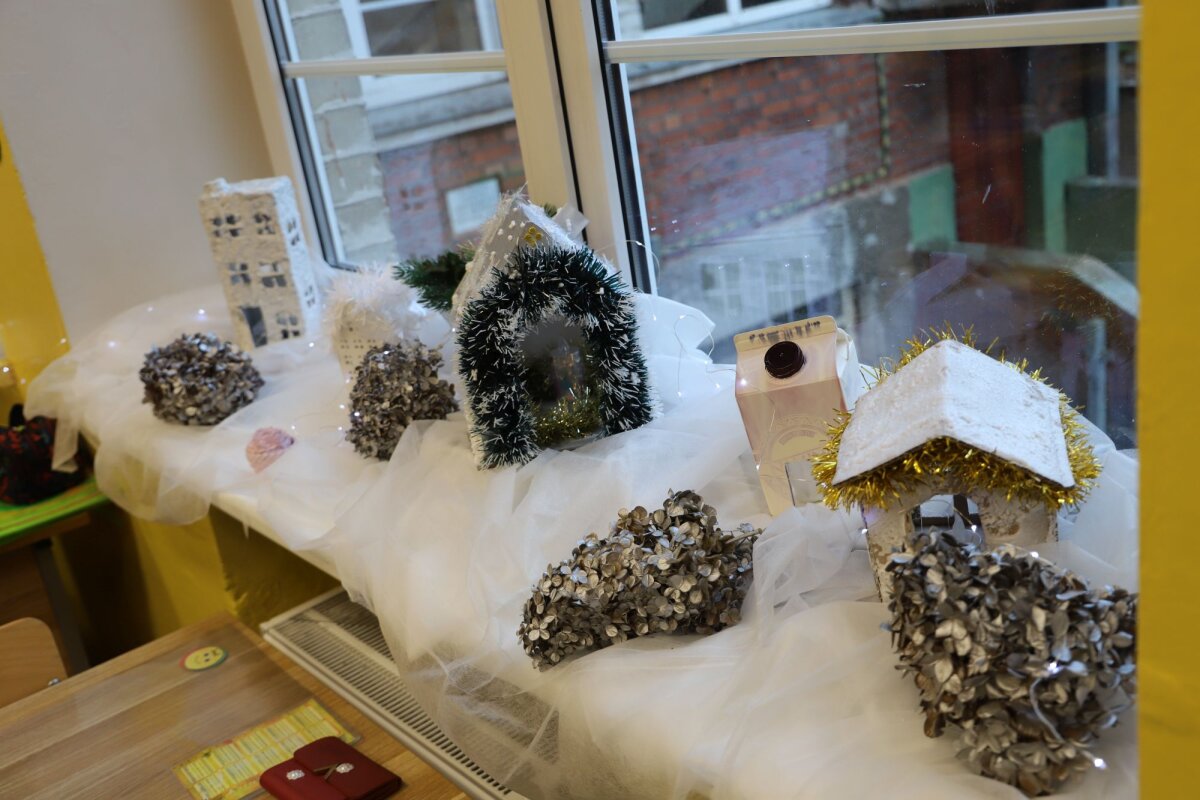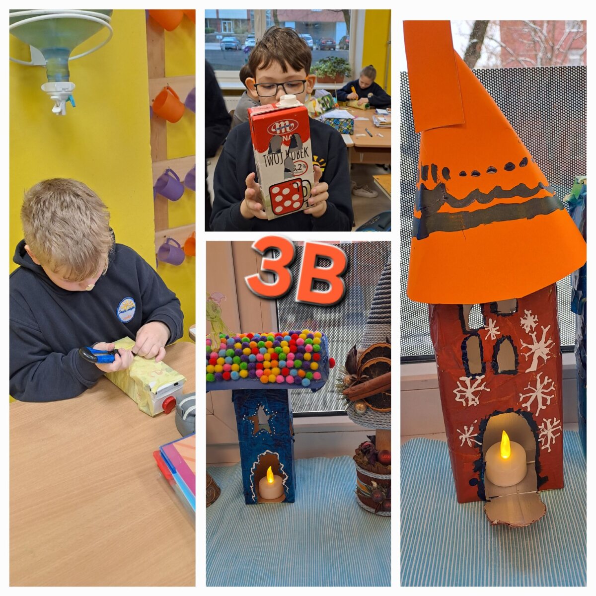 Pradinių klasių mokiniai gamino 3D namelius su kalėdiniais linkėjimais ir jais papuošė savo klases.