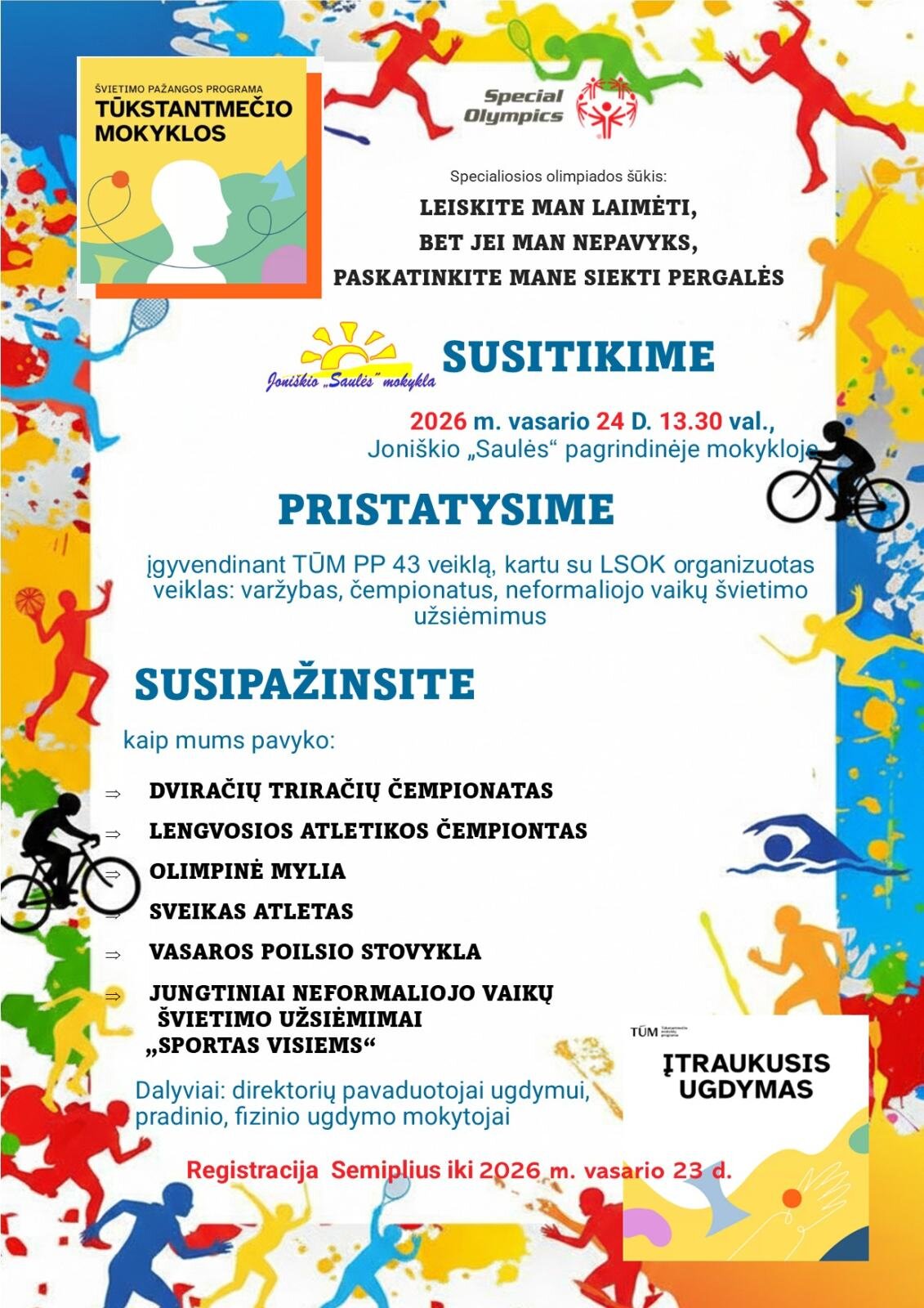 Įgyvendinant TŪM PP 43 veiklą, įvykdytos visos numatytos, suplanuotos veiklos. Kartu su LSOK (Lietuvos Specialiosios olimpiados komitetu) organizuotos varžybos, čempionatai, vasaros stovykla, neformaliojo vaikų švietimo užsiėmimai, juose dalyvavo įvairių poreikių ir galimybių mokiniai. Džiugu, kad gausybėje renginių dalyvavo ne tik „Saulės“ mokyklos mokiniai, bet Joniškio rajono bendrojo ugdymo mokyklų mokiniai ir respublikos mokyklų mokiniai. Organizuojant veiklas bendradarbiaujame su Joniškio Sporto centru, jie mus konsultuoja, padeda, o Lengvosios atletikos čempionate 2025, dalyvavo ir LSOK prezidentas Z. Misiūnas. O svarbiausia, kad dalyviai ne tik varžėsi dėl prizinių vietų, bet ir patyrė judėjimo džiaugsmą bei bendrystės jausmą.