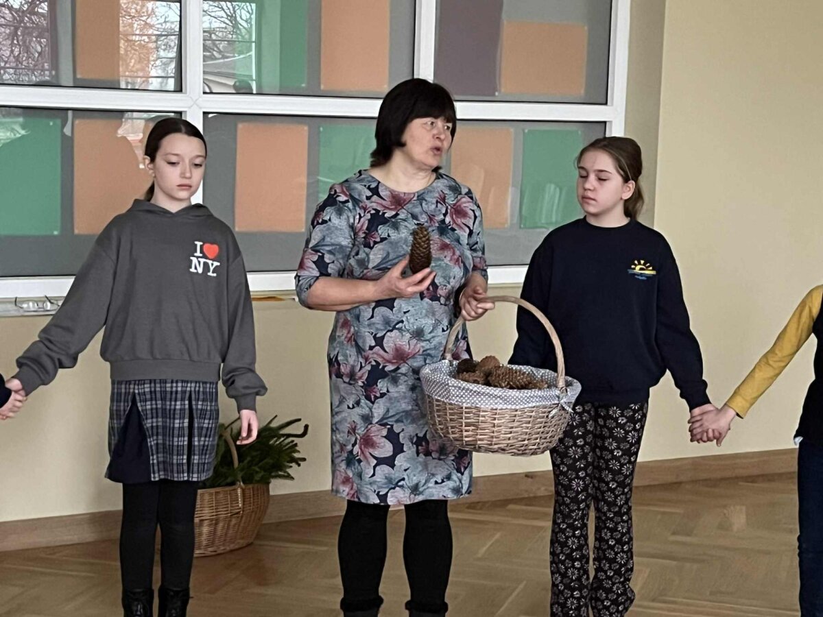 Mokiniai, įdėmiai klausydamiesi, kartu pynė bendrą advento vainiką. Į jį sugulė gyvos eglės šakelės, obuoliai, žvakutės, kankorėžiai ir kitos mokytojos atsineštos detalės – viskas, kas kuria šilumą ir jaukumą.