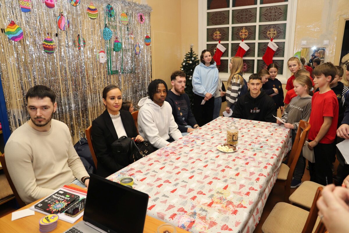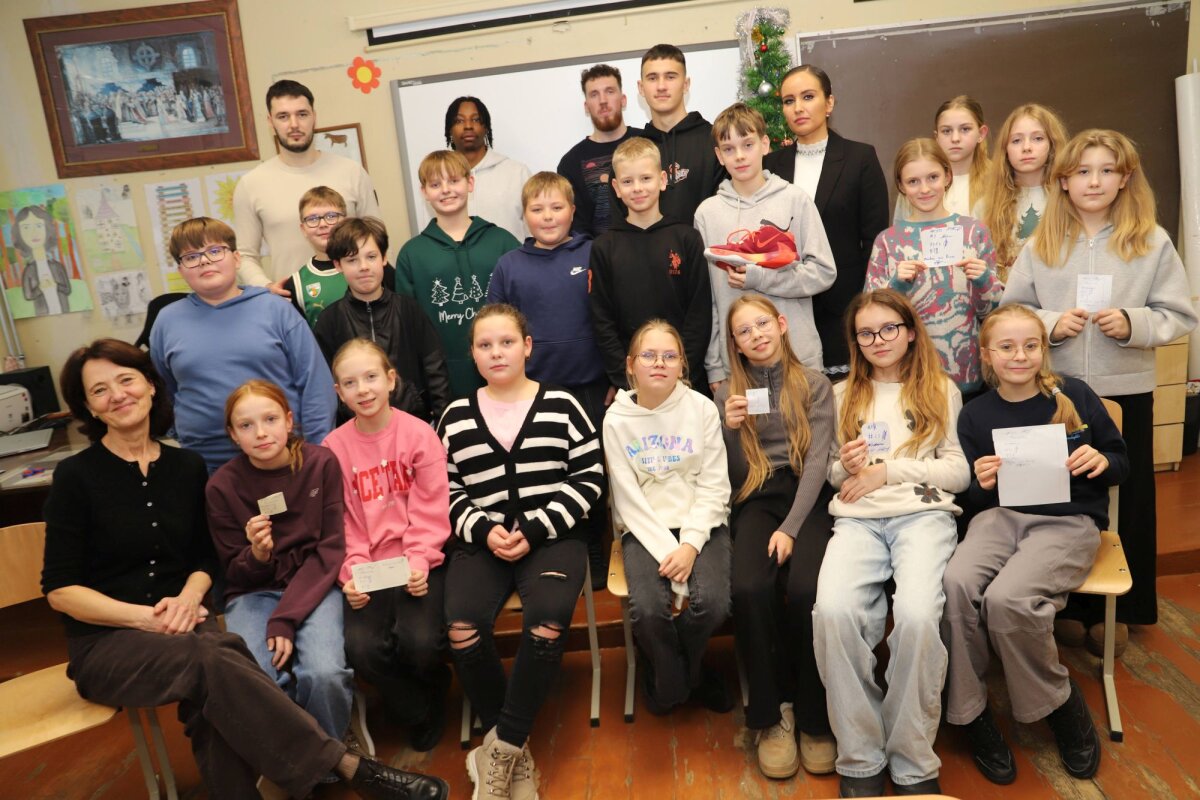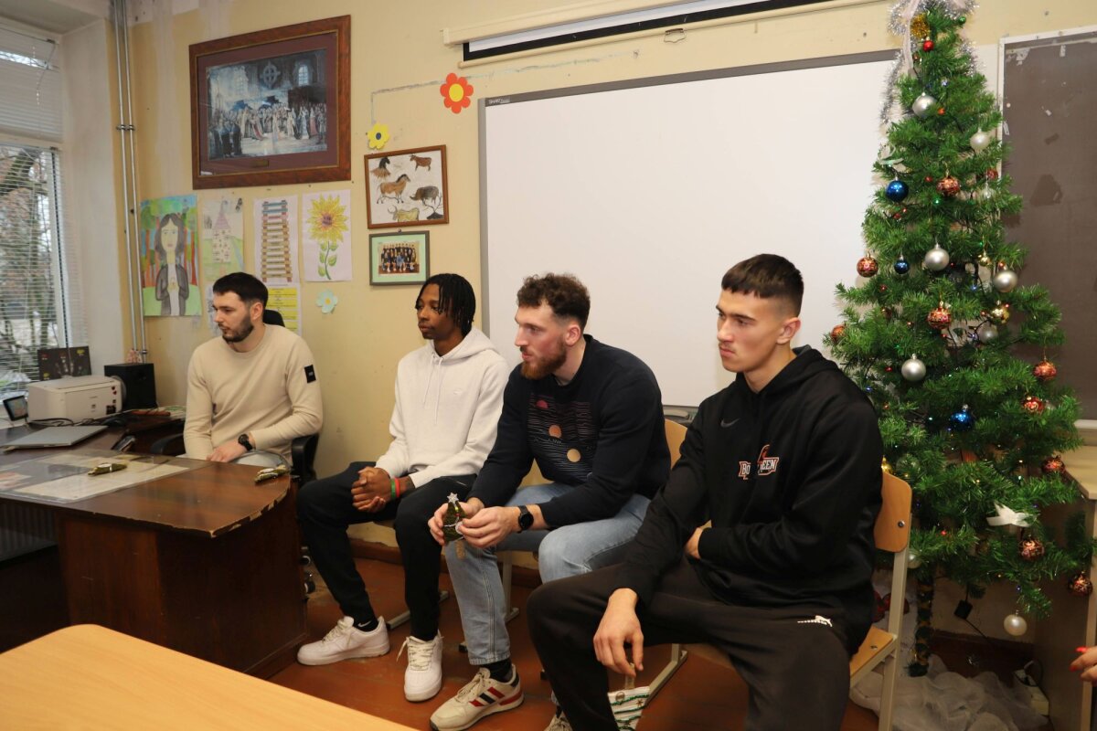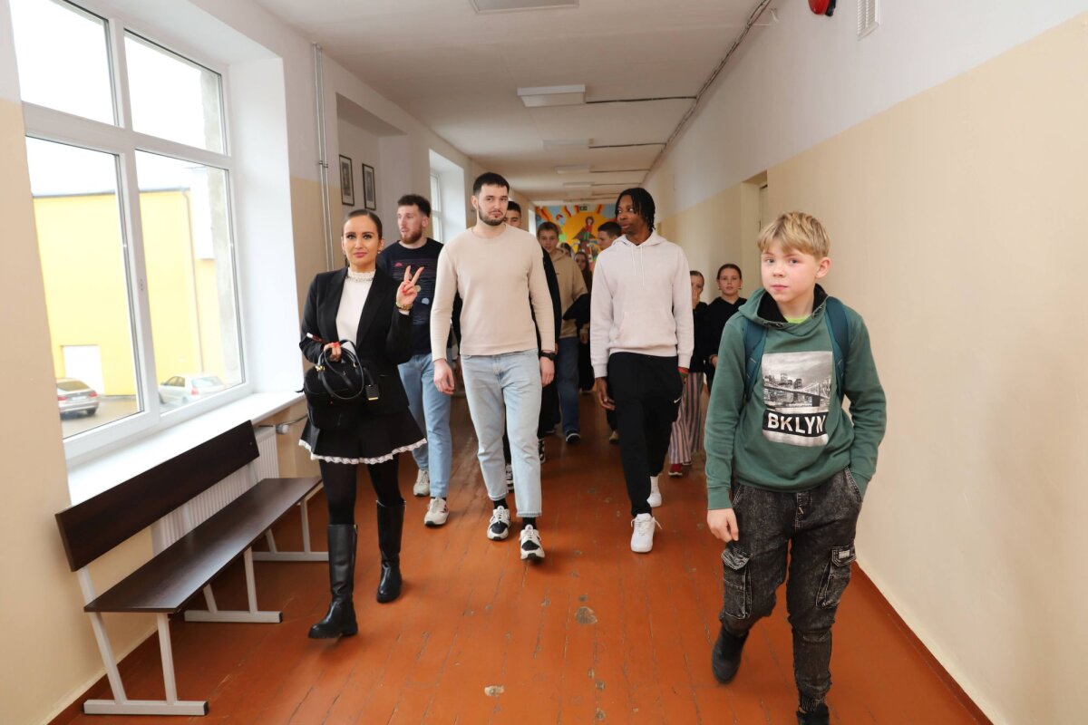 Pertraukų metu sportininkai apsilankė šiuo metu ,,Saulės“ pagrindinės mokyklos patalpose veikiančiame Joniškio rajono švietimo centro Vaikų dienos centre ,,Žadintuvas“, kur juos pasitiko gausus būrys vaikų bei socialinio darbo specialistė Vilma Štarevičienė. Atvykusiems svečiams, ,,Žadintuvo“ lankytojas, ,,saulietis“ Dovydas Baikštis padovanojo savo ir kitų vaikų gamintas kalėdines eglutes. Krepšininkas P. Ručinskas prisipažino, kad vaikų dienos centro lankytojų dovanota eglutė šiemet jo šeimos namuose bus pirmoji. Be integruotų pamokų ir pokalbių su jaunimu krepšininkai dalijo autografus mokiniams, pasirašinėjo net ant sportinių batų ir sportinės aprangos, mielai fotografavosi.