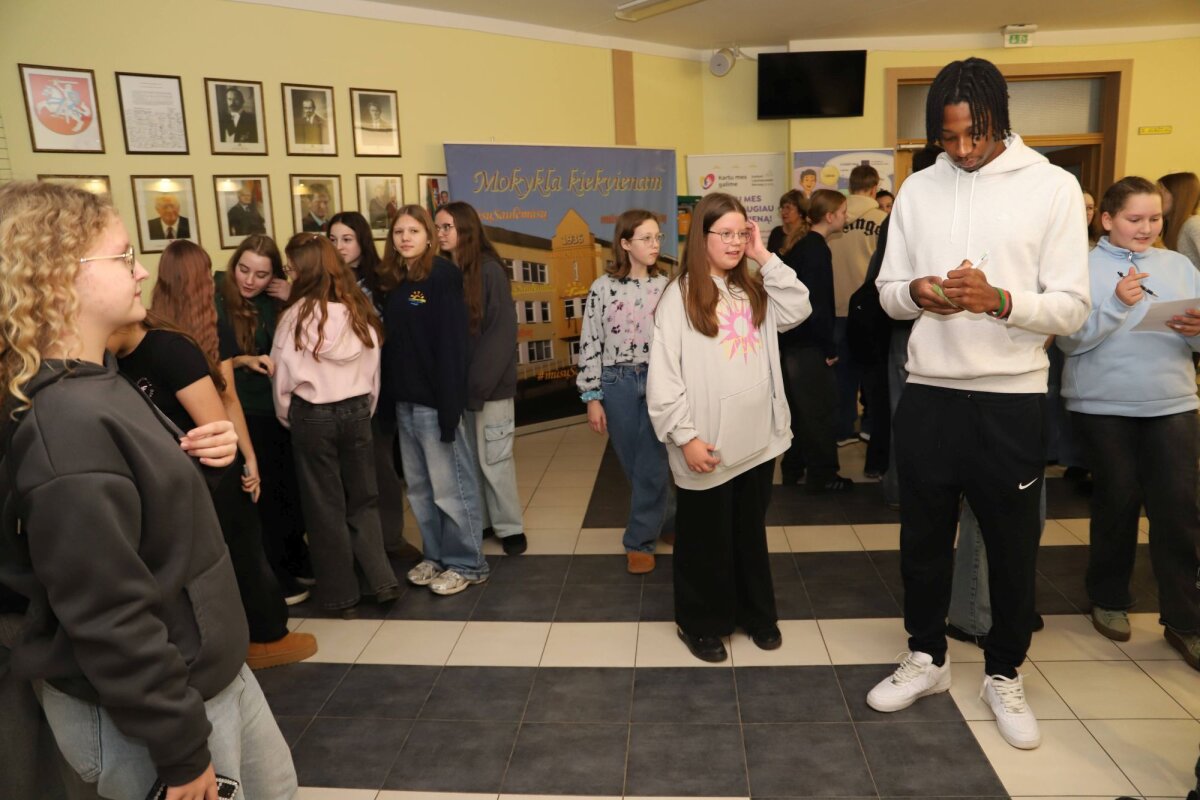 Į mokyklą atvykusius svečius pasitiko mokyklos direktorė Simona Jacienė, pavaduotoja Daiva Rocienė, pedagogai ir gausus būrys moksleivių.
