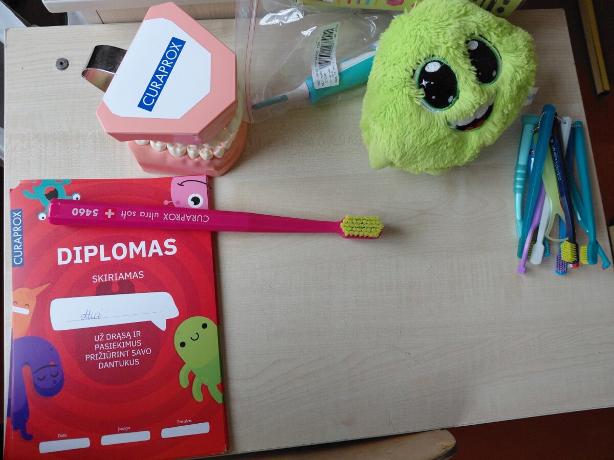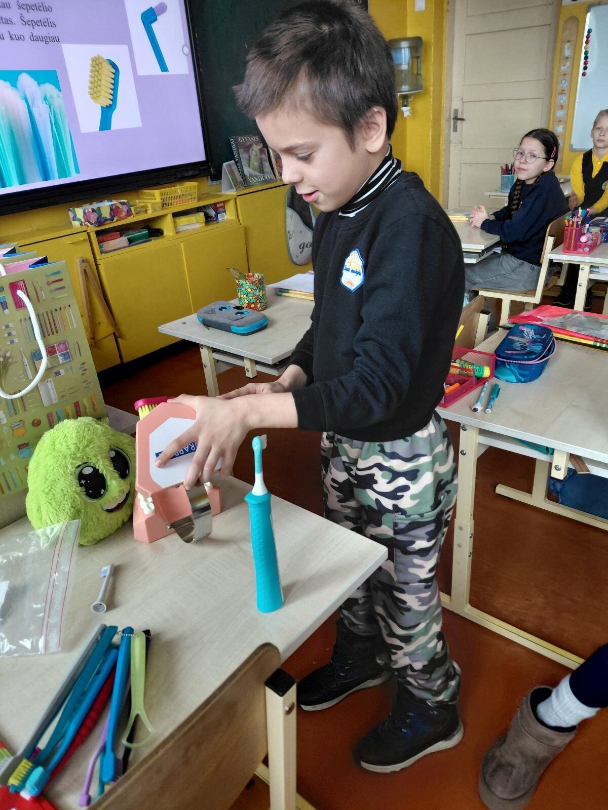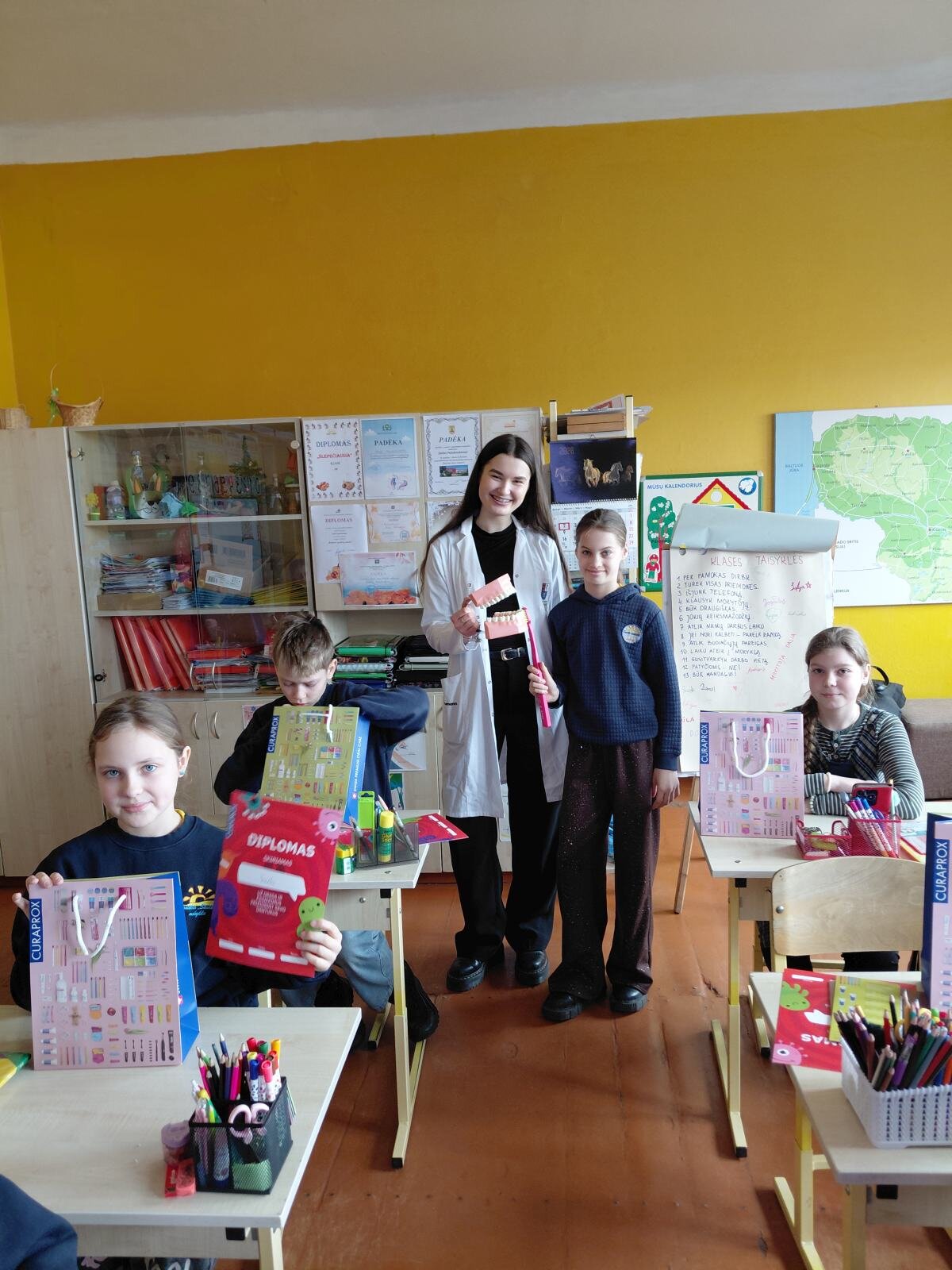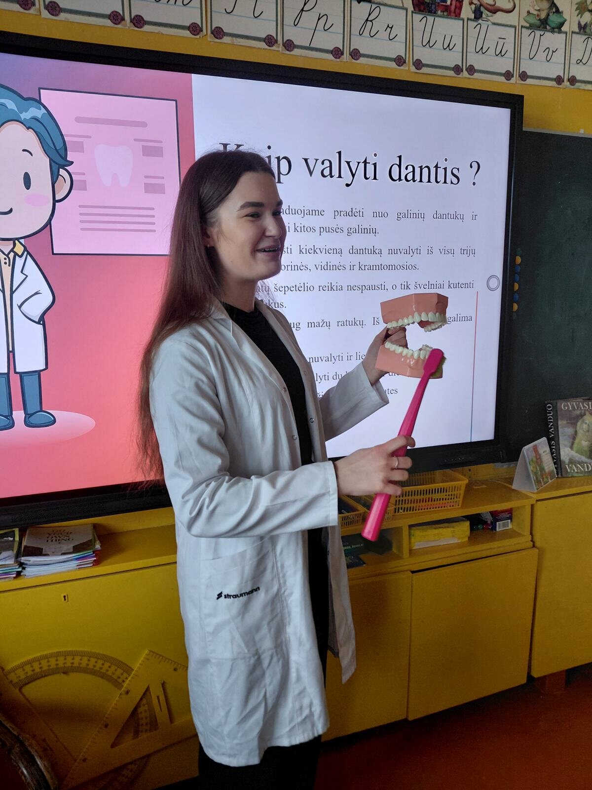 Į 4B klasę atvyko Lietuvos sveikatos mokslų burnos higienos specialybės IV kurso studentė Viktorija Povilaitytė. Ji ketvirtokus supažindino su burnoje gyvenančiomis bakterijomis, paaiškino, kaip tinkamai išsirinkti dantų valymo priemones ir jomis naudotis. Būsimoji sveikatos specialistė pristatė sveikų dantukų priežiūros rinkinį-įvairius šepetukus, tarpdančių siūlą, liežuvėlio valiklį, dantų pastas. Prezentacijos metu aiškino, ką daryti, kad dantys būtų sveiki ir gražūs ir kaip tinkamai valyti dantukus. Po to atsakė į vaikų užduotus klausimus. Susitikimo pabaigoje vaikai savo žinias galėjo pasitikrinti viktorinoje. Už aktyvų dalyvavimą ir labai geras žinias kiekvienas buvo apdovanotas sveikų dantukų priežiūros rinkiniu.