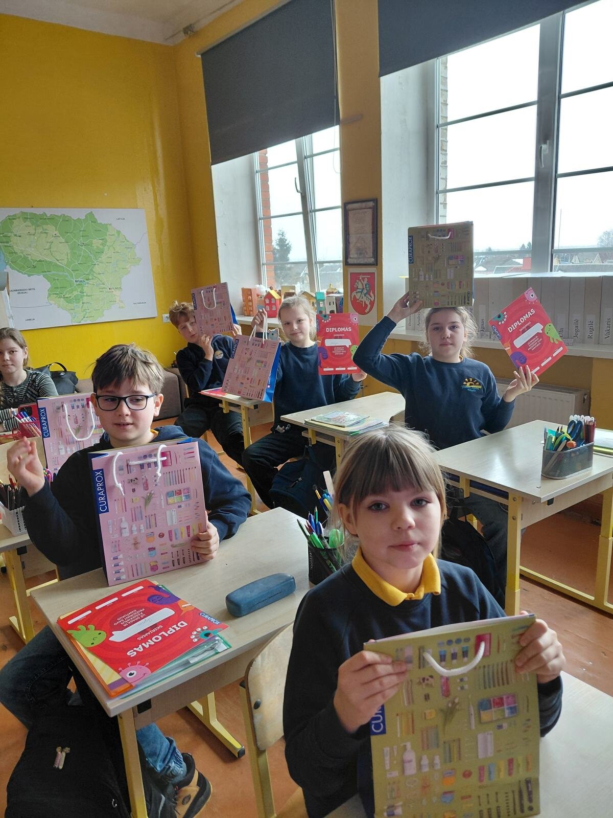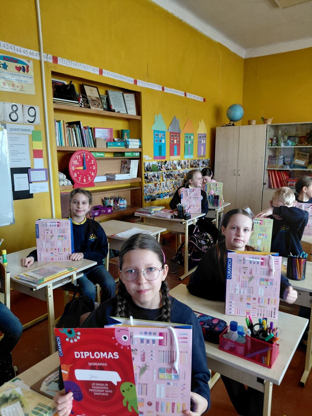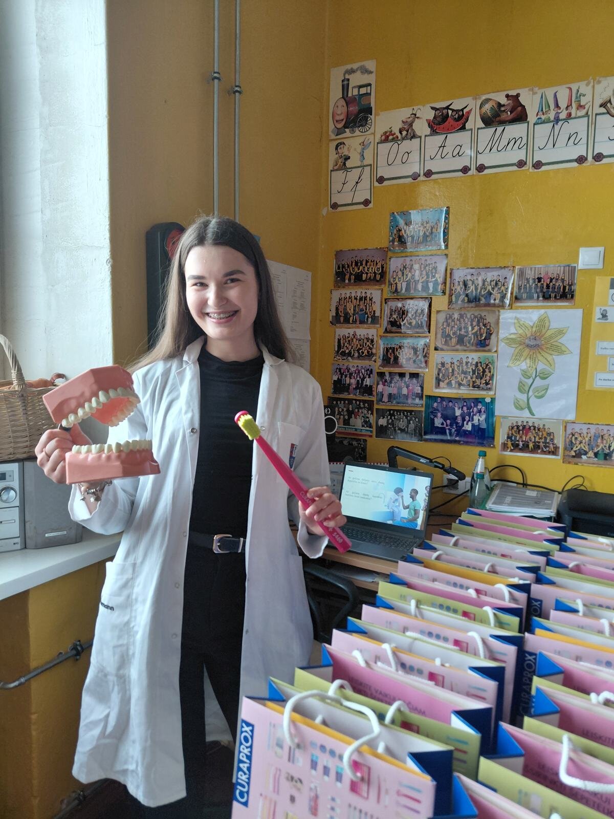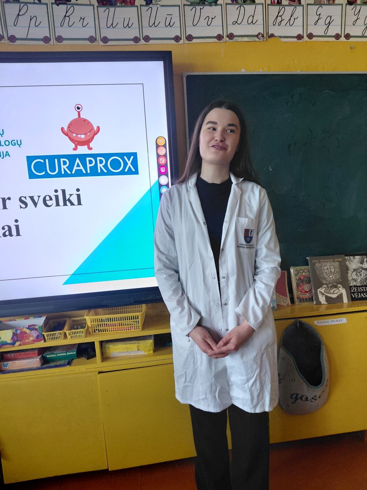 Į 4B klasę atvyko Lietuvos sveikatos mokslų burnos higienos specialybės IV kurso studentė Viktorija Povilaitytė. Ji ketvirtokus supažindino su burnoje gyvenančiomis bakterijomis, paaiškino, kaip tinkamai išsirinkti dantų valymo priemones ir jomis naudotis. Būsimoji sveikatos specialistė pristatė sveikų dantukų priežiūros rinkinį-įvairius šepetukus, tarpdančių siūlą, liežuvėlio valiklį, dantų pastas. Prezentacijos metu aiškino, ką daryti, kad dantys būtų sveiki ir gražūs ir kaip tinkamai valyti dantukus. Po to atsakė į vaikų užduotus klausimus. Susitikimo pabaigoje vaikai savo žinias galėjo pasitikrinti viktorinoje. Už aktyvų dalyvavimą ir labai geras žinias kiekvienas buvo apdovanotas sveikų dantukų priežiūros rinkiniu.